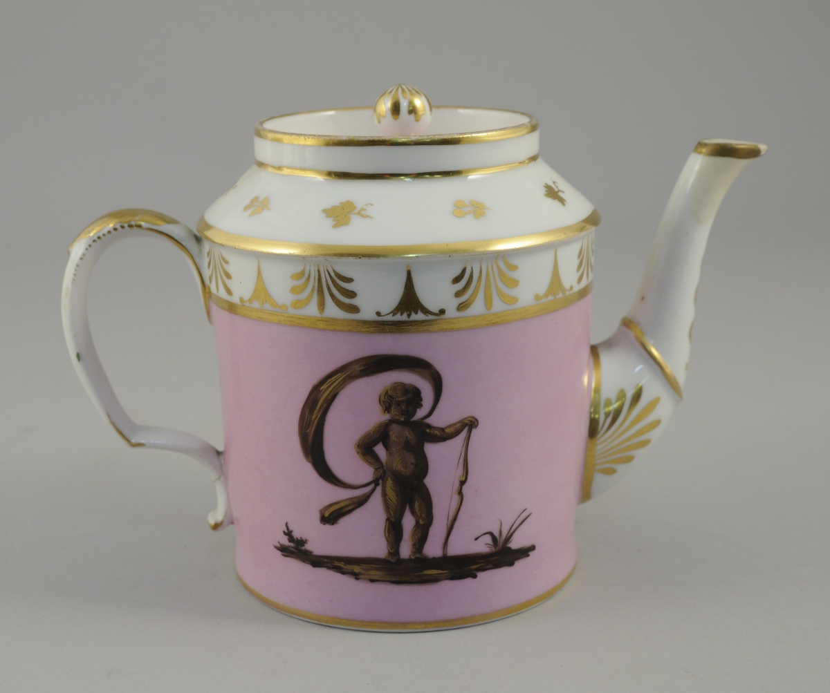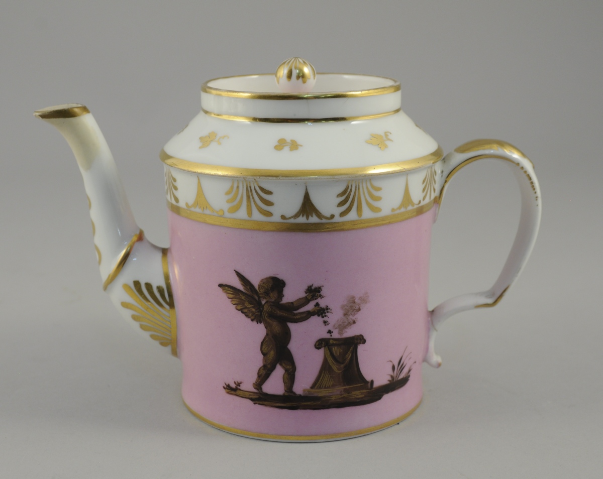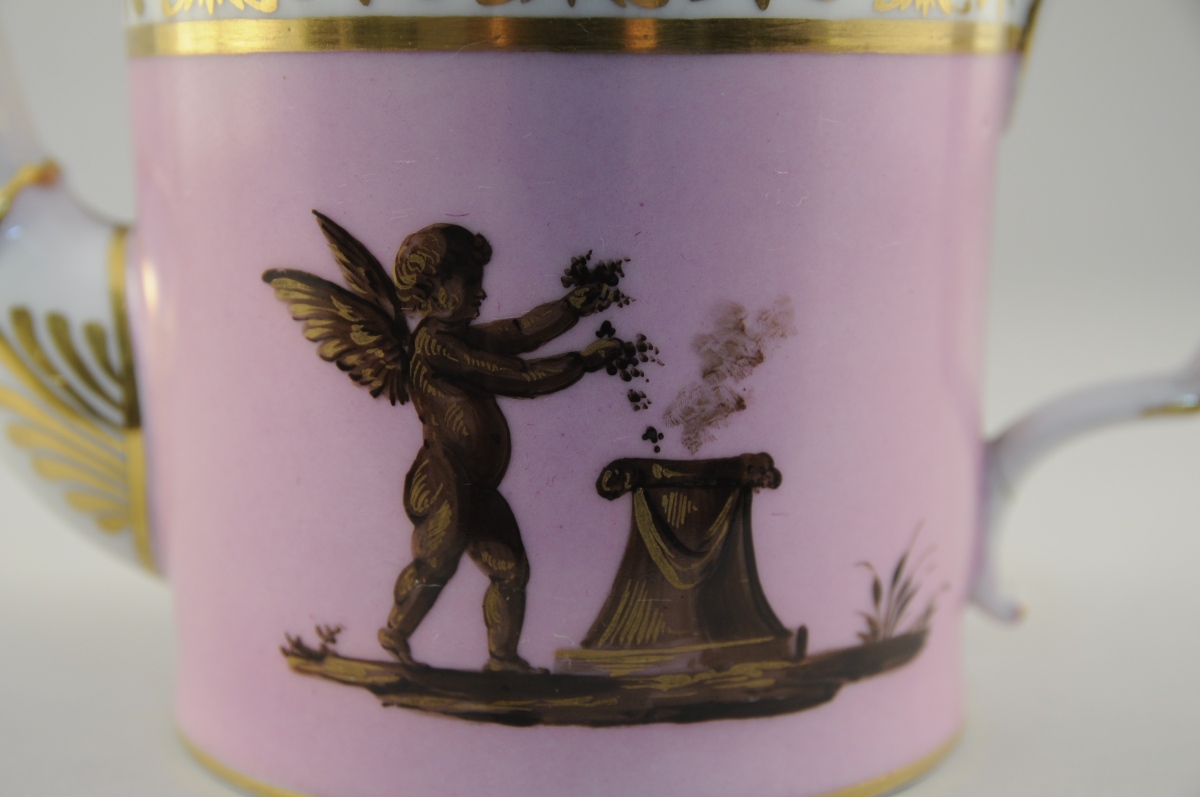 PARIS. THÉIÈRE en porcelaine couverte de forme cylindrique à décor brun et or sur fond vieux rose d'angelots. L'un immole du raisin l'autre, drapé, s'appuie fièrement sur son arc. Décor or sur fond blanc de palmettes, feuilles de vigne et d'un serpent transpercé d'une flèche.