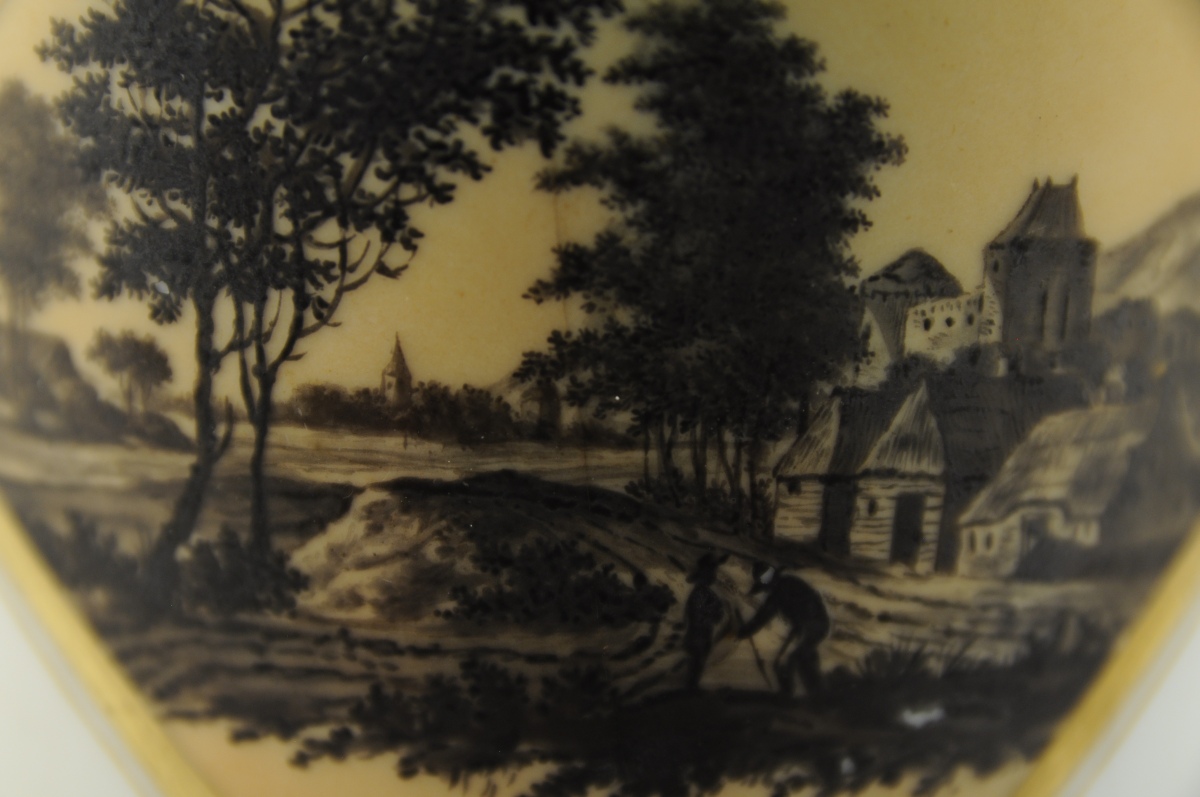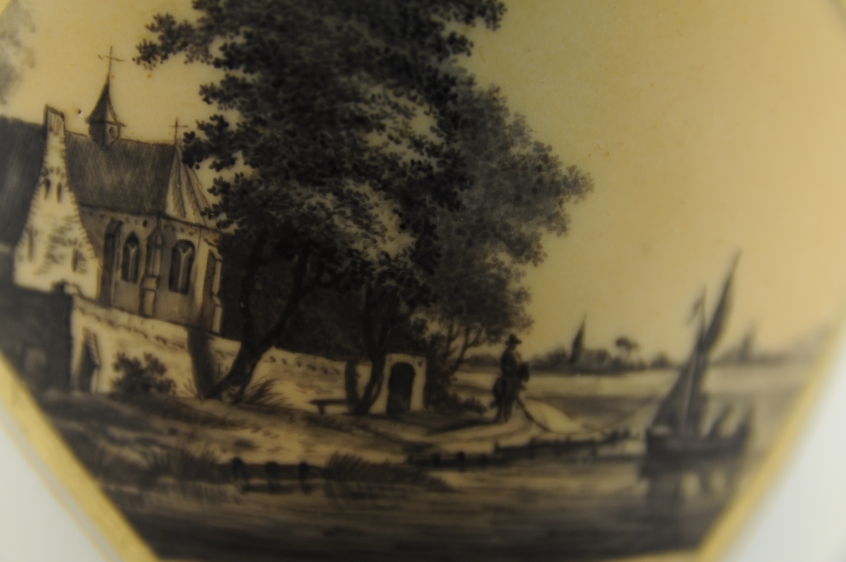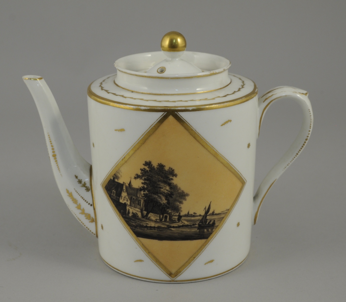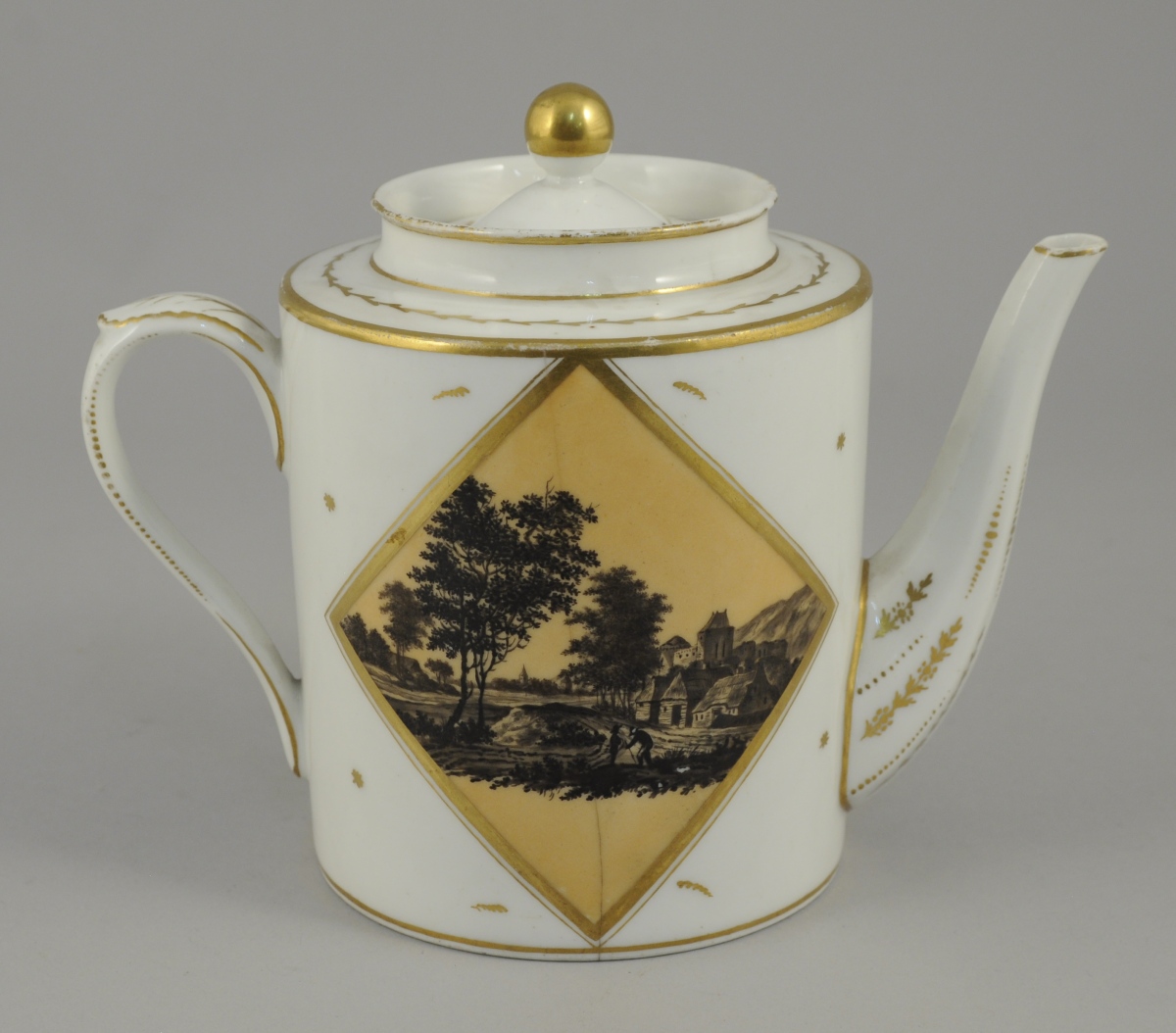 PARIS. THÉIÈRE en porcelaine couverte de forme cylindrique à fond blanc orné or de motifs feuillagés. Scènes villageoises traitées en camaïeu gris sur fond orangé dans deux réserves losangiques.