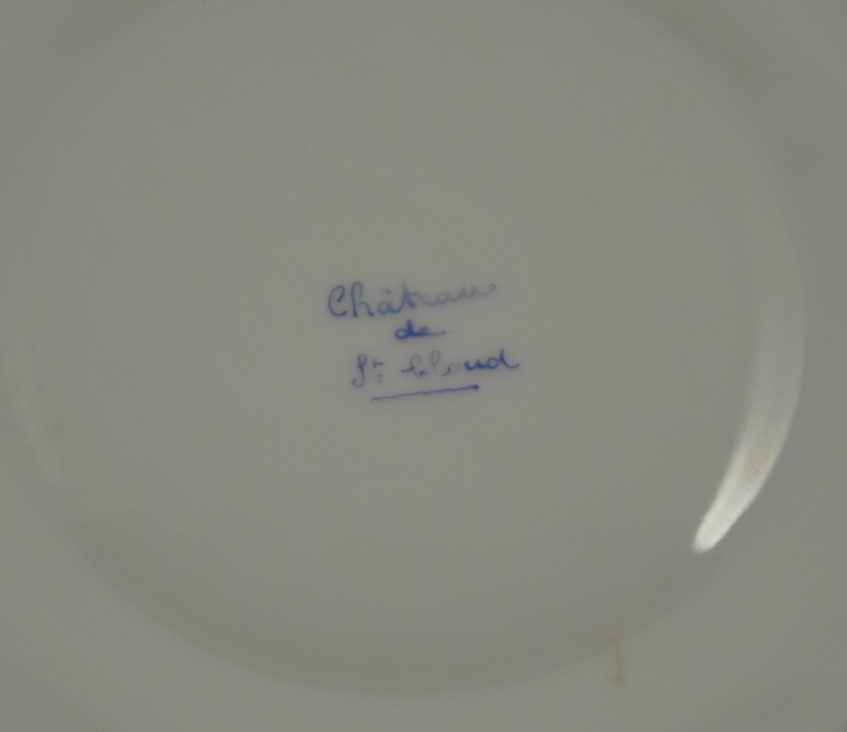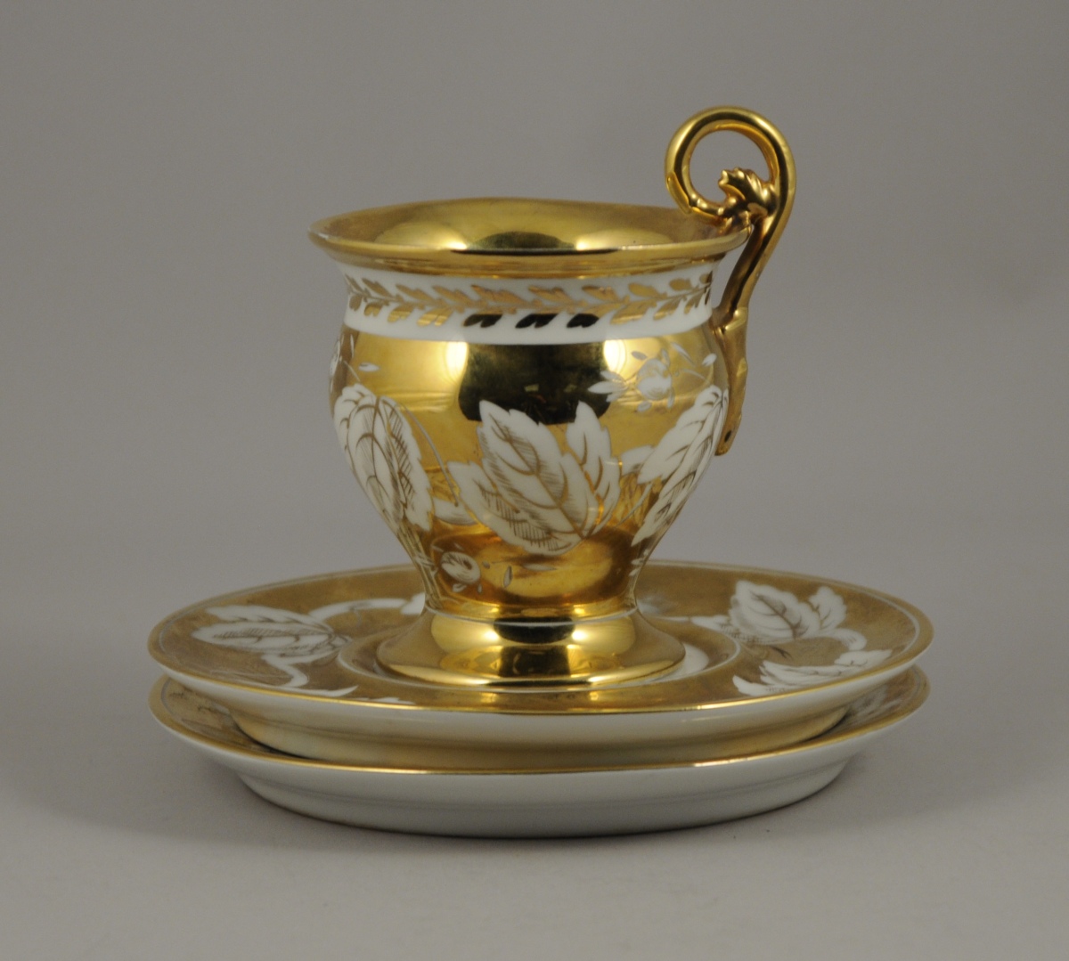 SAINT-CLOUD. TASSE et deux SOUS-TASSES en porcelaine blanche à décor d'une branche feuillagée en réserve sur fond or. La tasse reçoit en plus une frise de feuilles de laurier or sur fond blanc et une anse s'achevant en une volute feuillagée. Marque "Château de St Cloud" en bleu sur couverte.