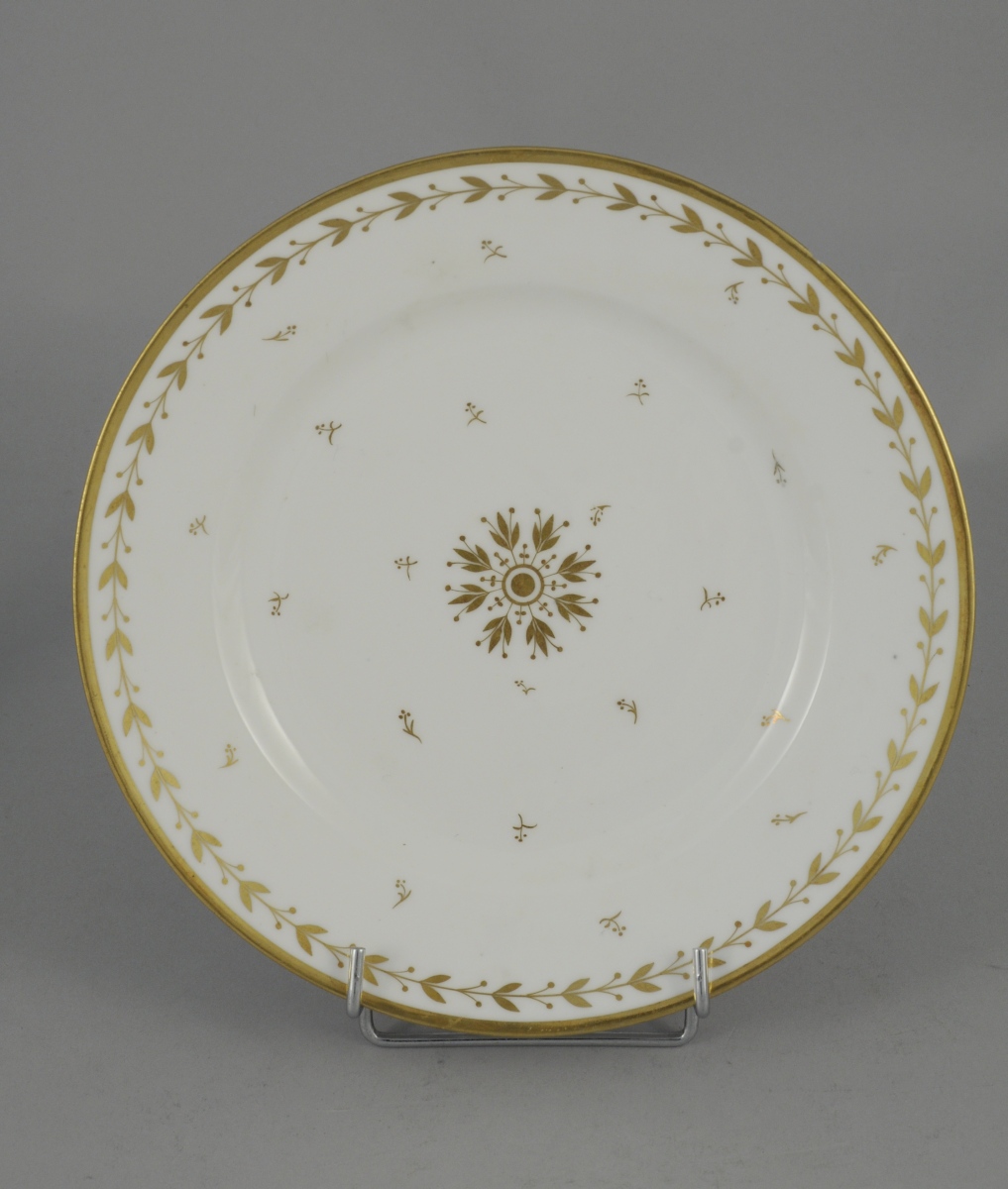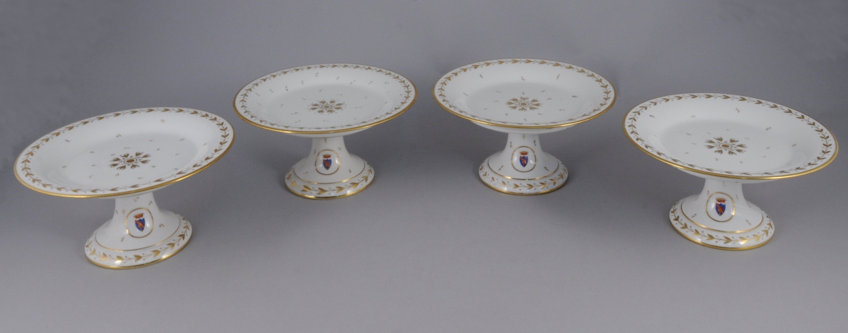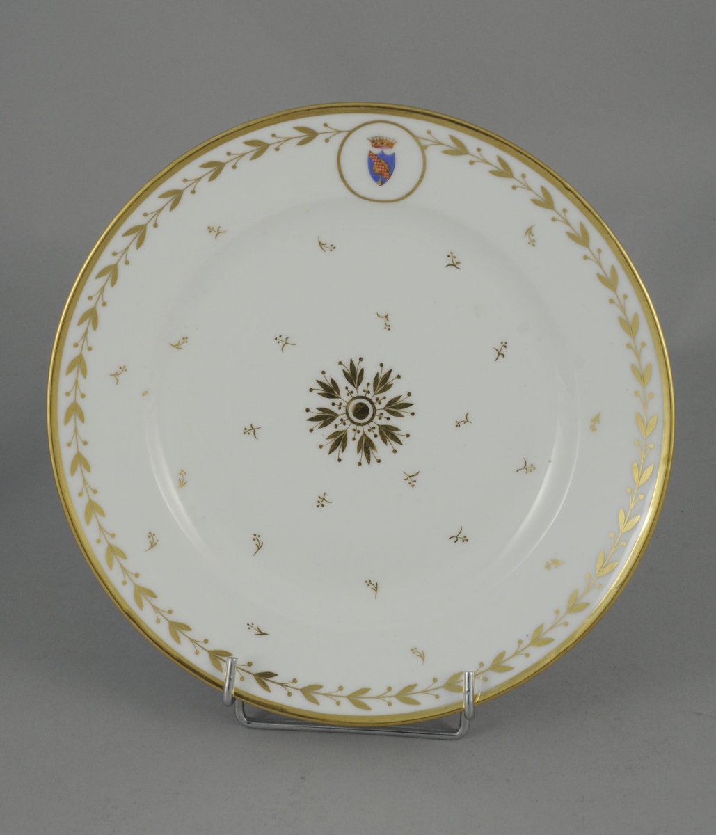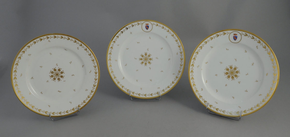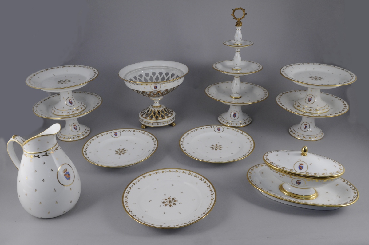 SÈVRES. PARTIE de SERVICE en porcelaine blanche armoriée timbrée d'une couronne comtale à décor or de frises de feuilles et fruits de laurier, rosace, semis de fleurettes et filet or sur les bords. Il comprend 11 pièces: trois assiettes (une non armoriée), quatre assiettes montées, un serviteur muet, une corbeille à fruits, une saucière à plateau adhérent et un broc à eau.