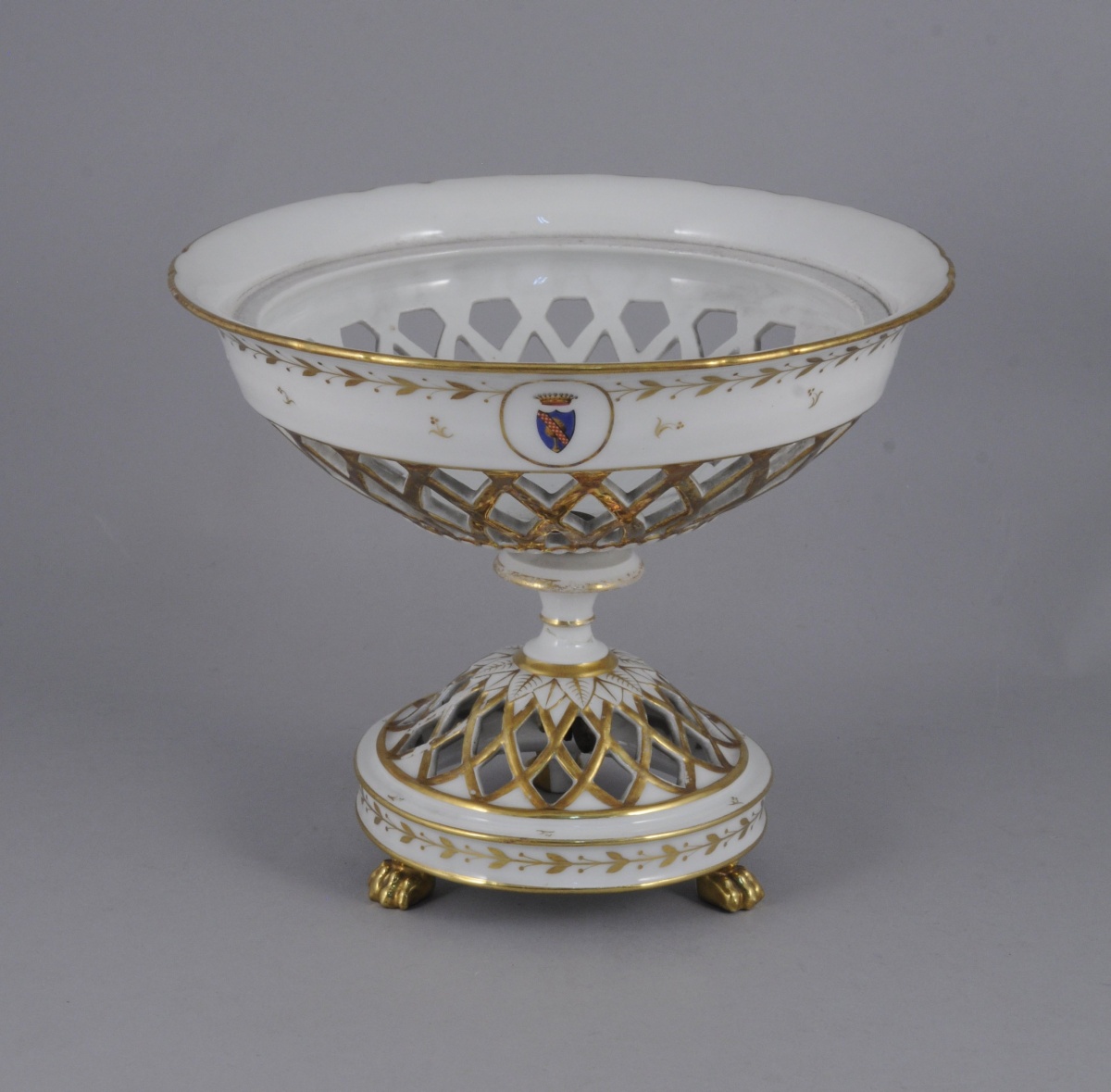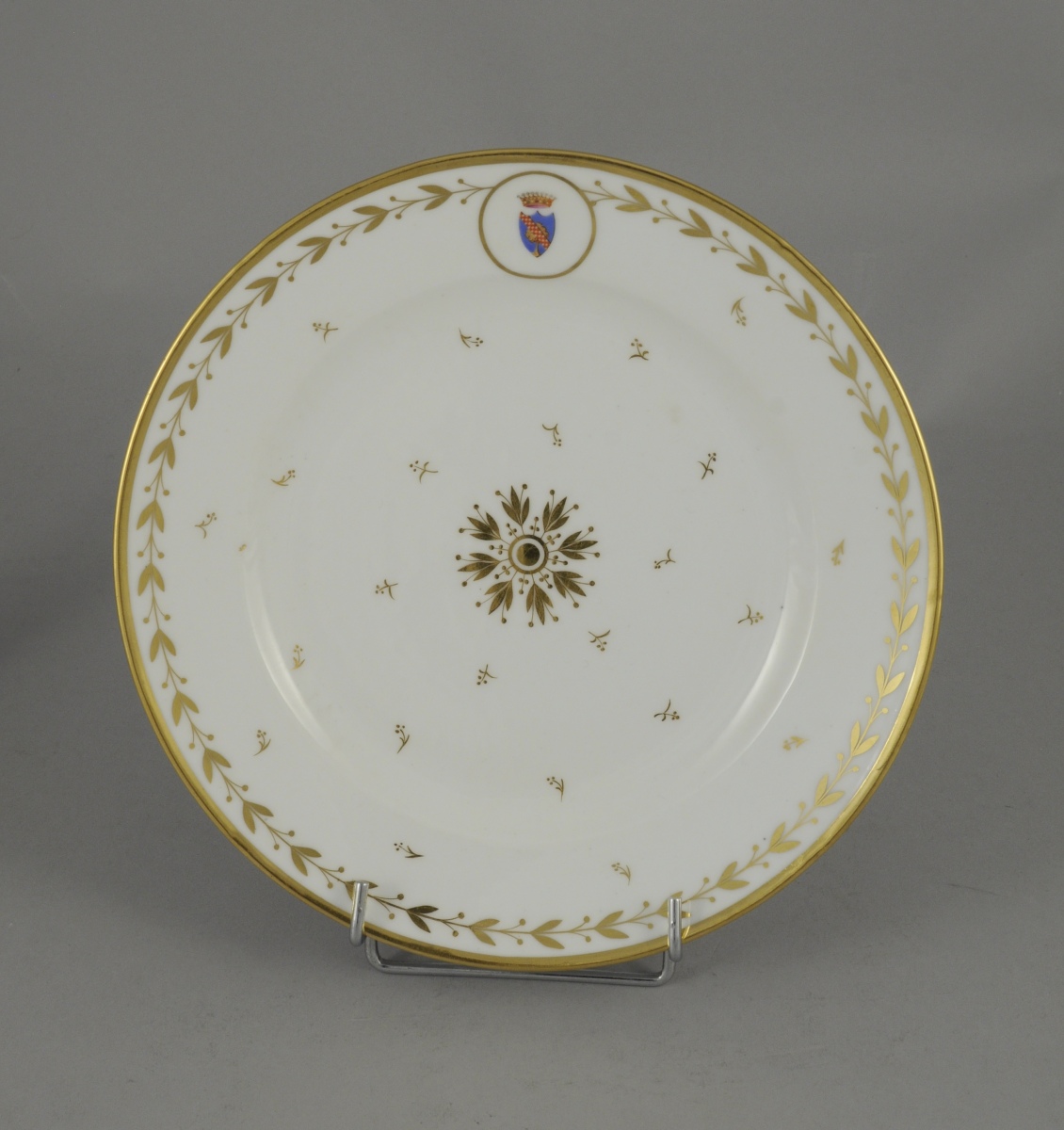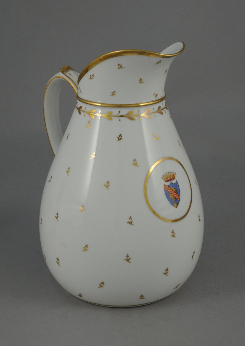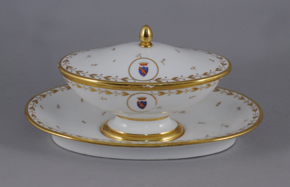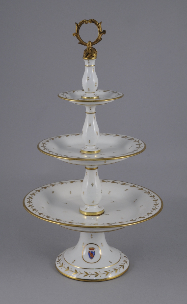 SÈVRES. PARTIE de SERVICE en porcelaine blanche armoriée timbrée d'une couronne comtale à décor or de frises de feuilles et fruits de laurier, rosace, semis de fleurettes et filet or sur les bords. Il comprend 11 pièces: trois assiettes (une non armoriée), quatre assiettes montées, un serviteur muet, une corbeille à fruits, une saucière à plateau adhérent et un broc à eau.