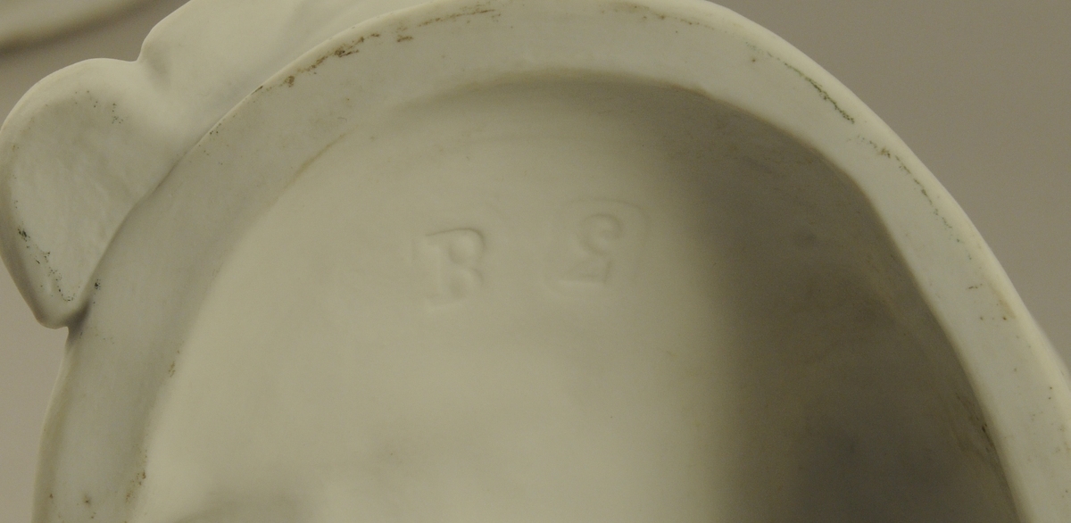 VIDE-POCHE en biscuit figurant un angelot chevauchant un escargot. La coupelle adoptant la forme d'une large feuille. Marques en creux "B" et "3".