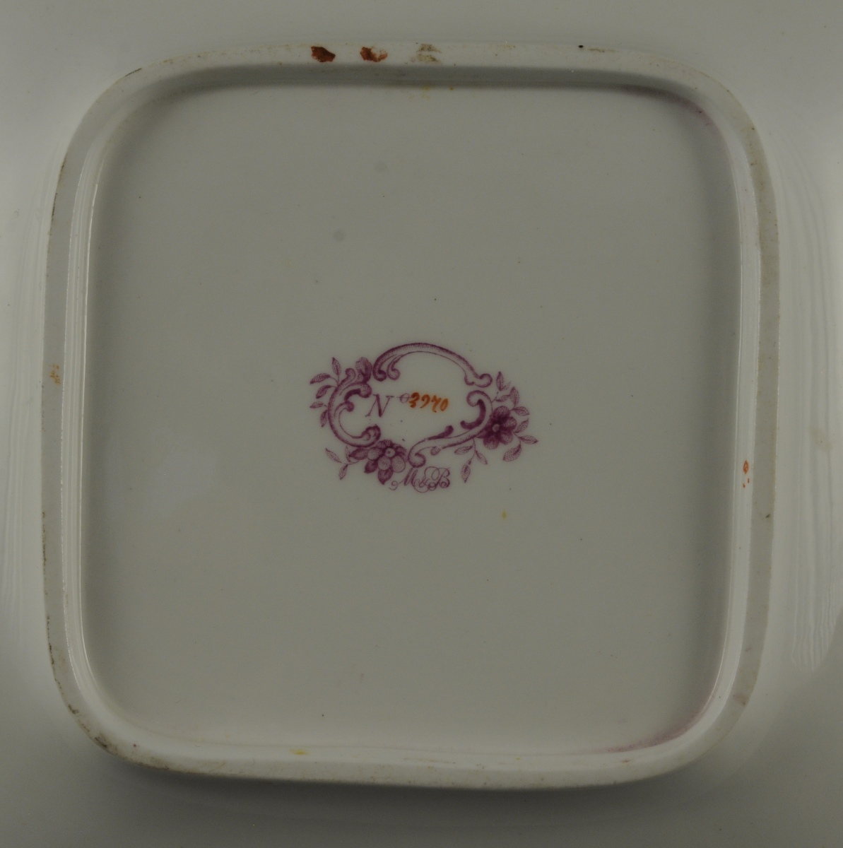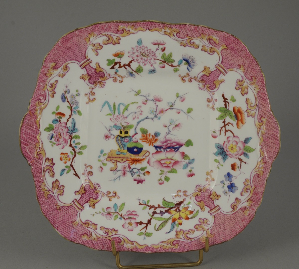 ANGLETERRE. MINTON. PLAT de service carré en porcelaine. Décor floral dans des réserves, sur fond rose bordées de rinceaux or, dans le goût du Japon. Marque au tampon en rose "MB" pour Minton and Boyle. Etiquette manuscrite "Minton and Boyle / 1836 / H".