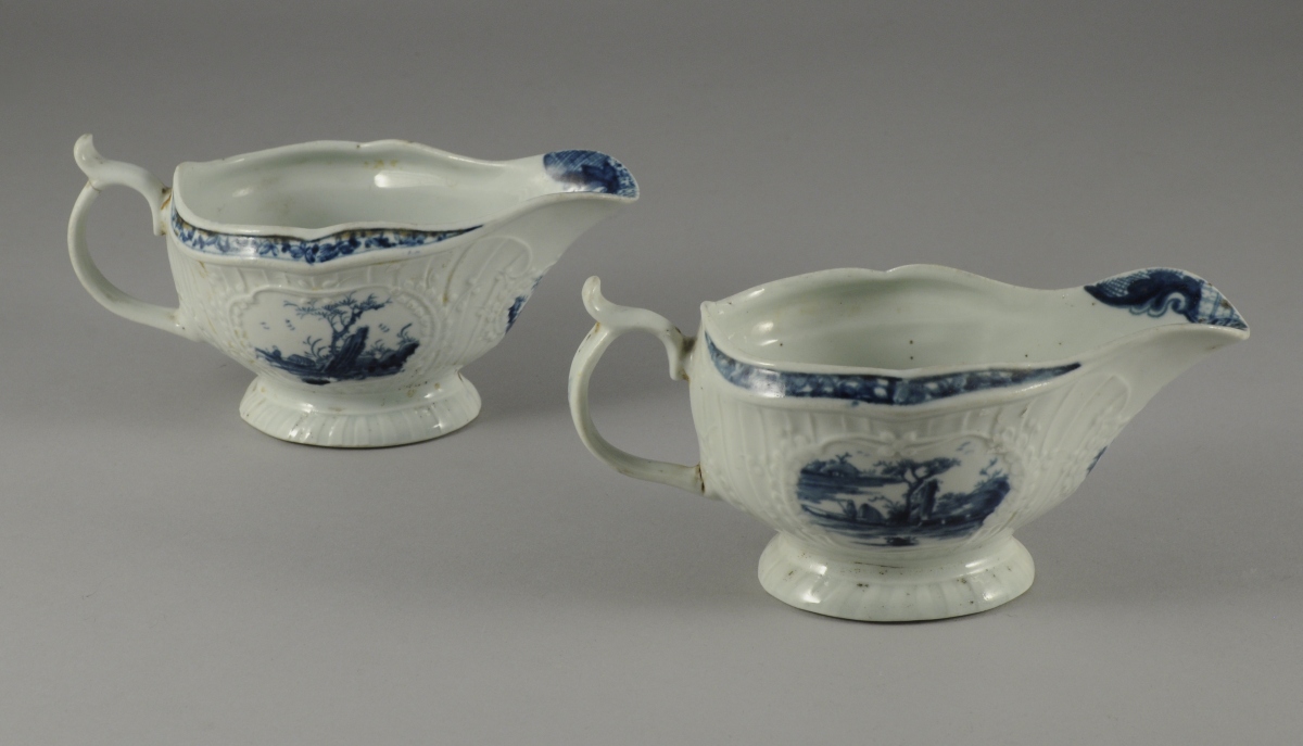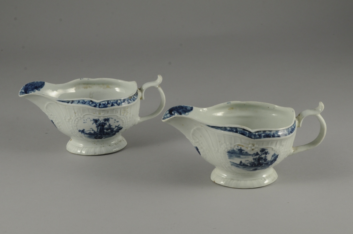 ANGLETERRE. PAIRE DE SAUCIÈRES en porcelaine tendre à décor blanc et bleu de scènes champêtres dans des cartouches. L'une des anses marquée "R".