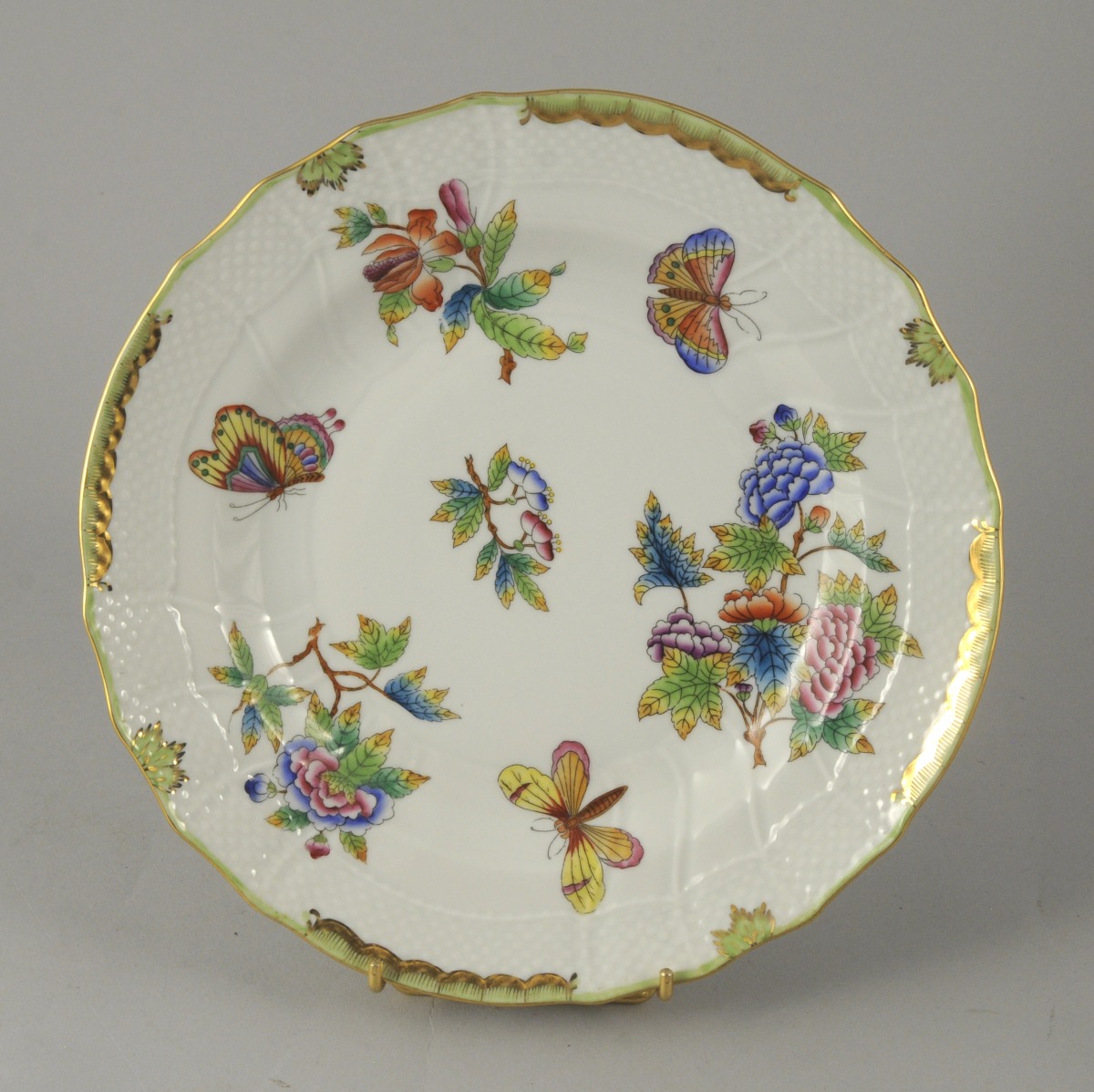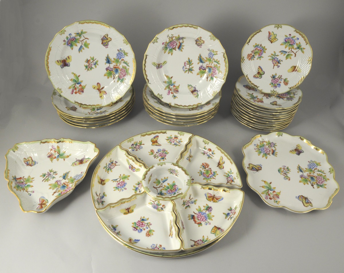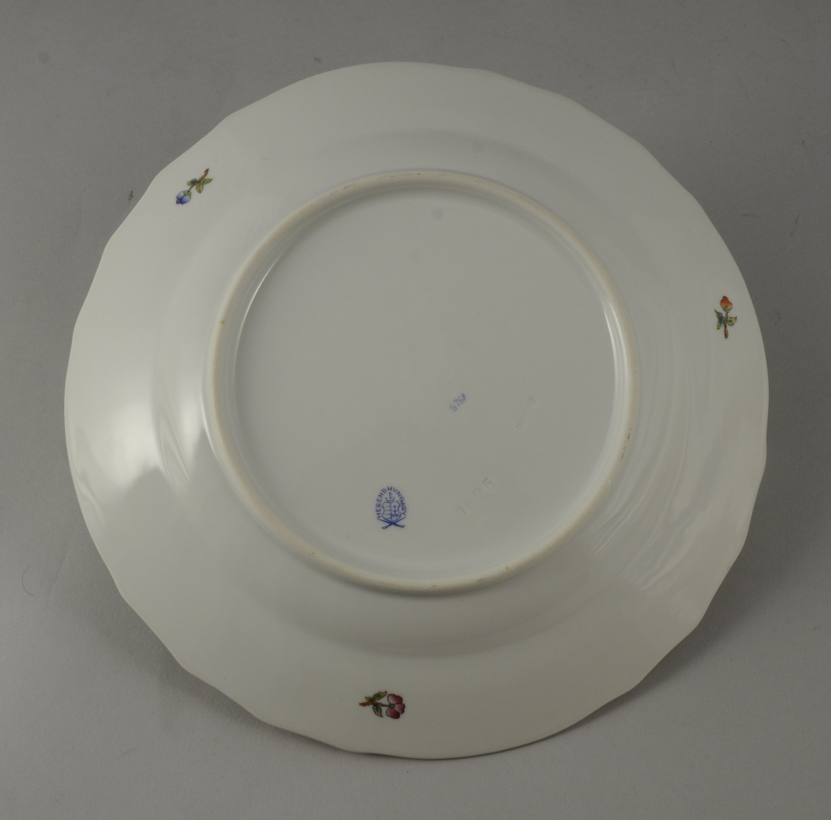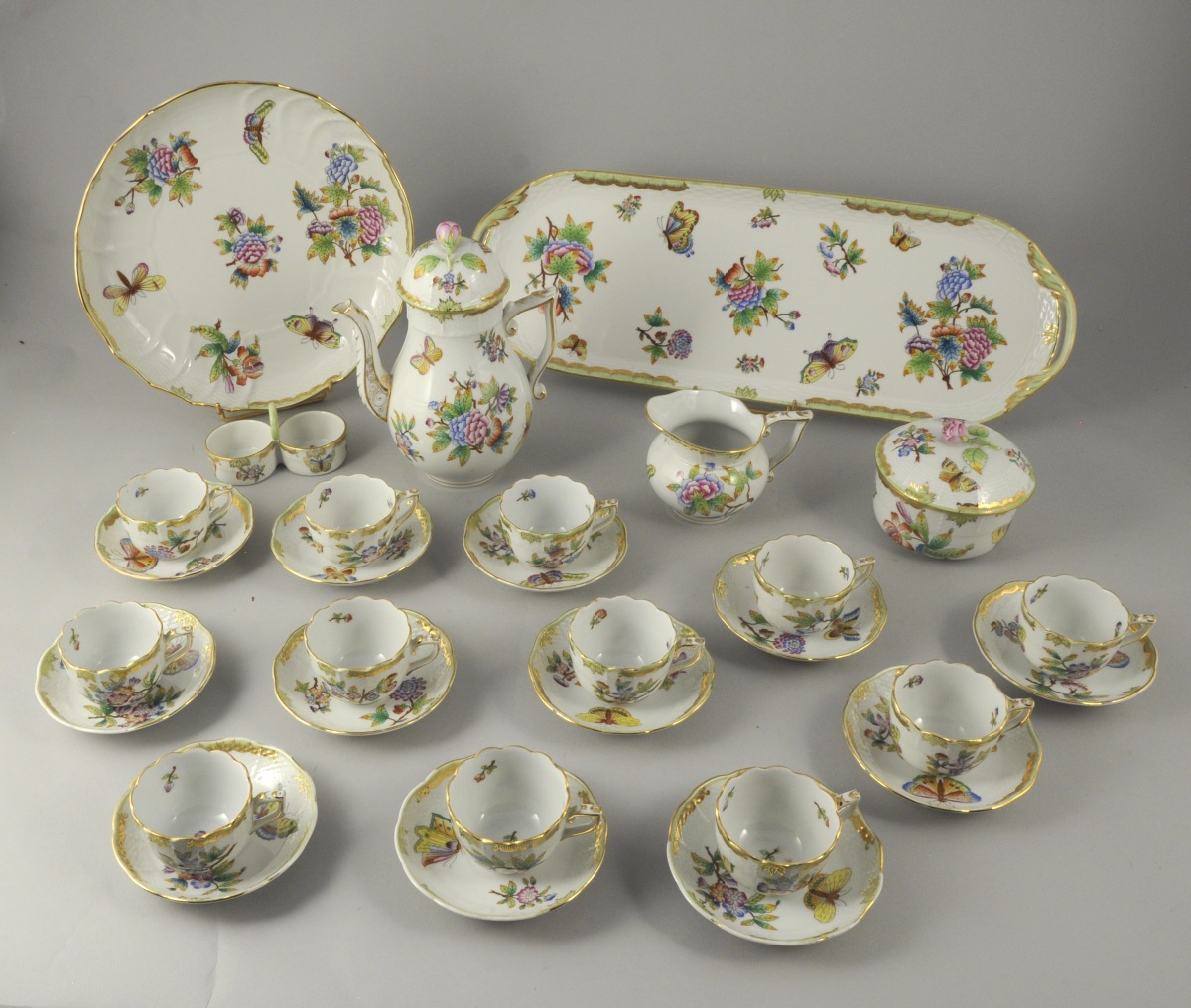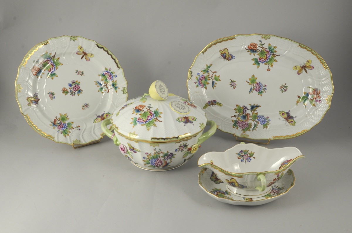 Il comprend 68 pièces: 6 assiettes creuses, 6 assiettes plates, 6 assiettes à fromage, 6 assiettes à dessert, 1 plat rond, 1 plat rond creux, 1 plat ovale, 1 plat à cake, 1 plat ovale ondulé, 1 petit plat ovale creux, 1 pot à lait, 1 sucrier avec couvercle, 1 verseuse avec couvercle, 12 tasses à café, 12 soucoupes, 1 salière, 1 plat support ravier et 5 raviers, 1 saucière ronde, 1 grande saucière, 1 plat creux triangulaire, 1 soupière avec couvercle.