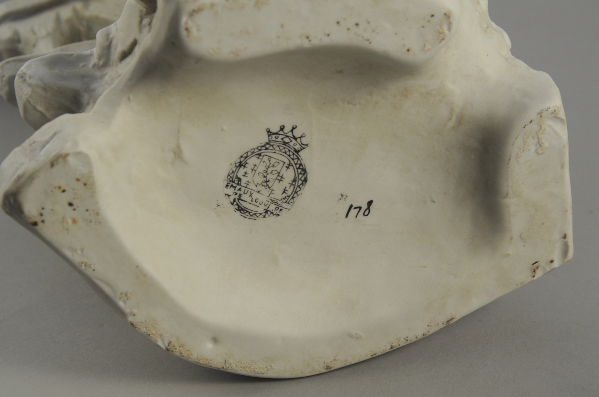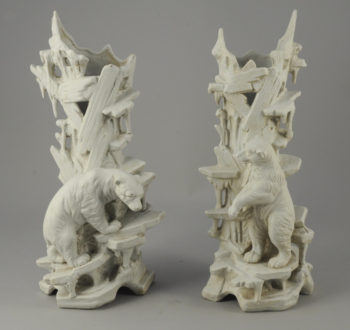 LA LOUVIÈRE. PAIRE DE VASES en biscuit, à décor de deux ours en ronde-bosse dans un paysage montagnard. Marque des Emaux de La Louvière (Belgique) au revers. Marqués en creux "1504" sur le pied