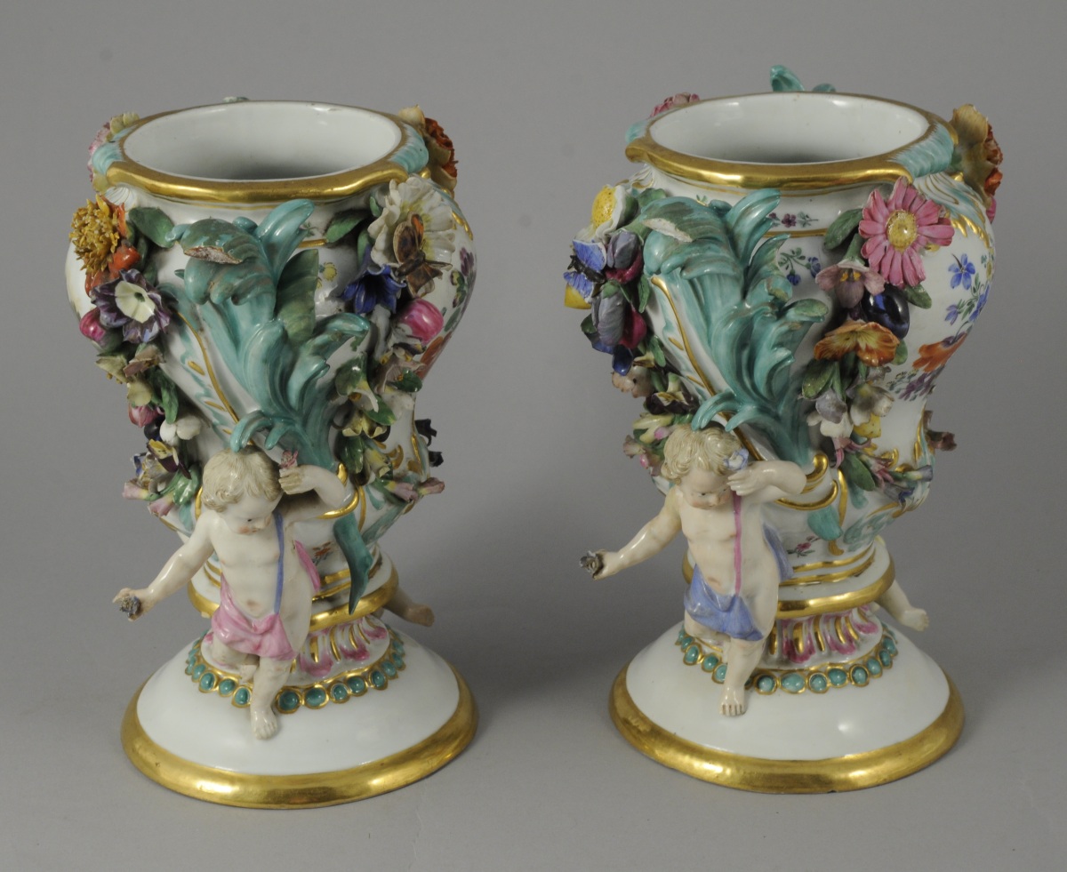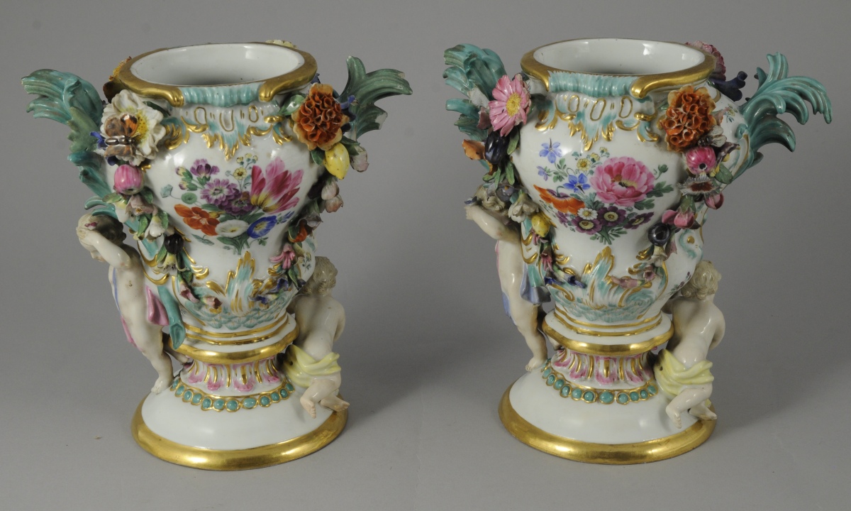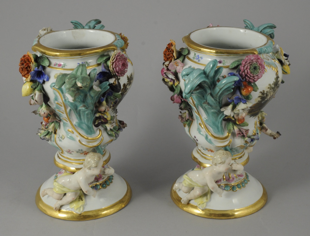MEISSEN. PAIRE de VASES en porcelaine. Décor en relief polychrome et or de putti, feuillages, fleurs, fruits, perles et filets or. Scènes champêtres et bouquets fleuris sur la panse. Marque de Meissen en bleu au revers.