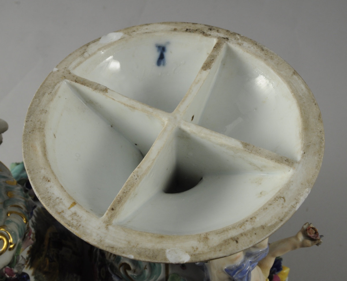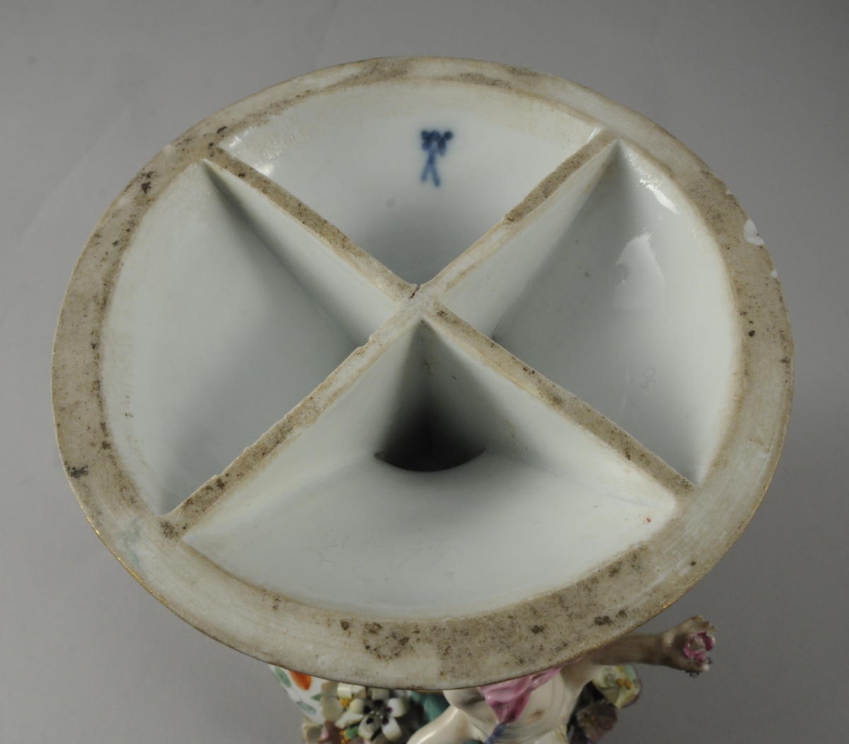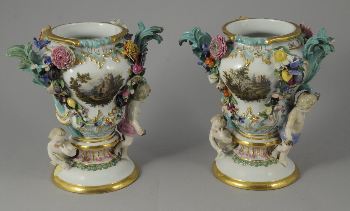 MEISSEN. PAIRE de VASES en porcelaine. Décor en relief polychrome et or de putti, feuillages, fleurs, fruits, perles et filets or. Scènes champêtres et bouquets fleuris sur la panse. Marque de Meissen en bleu au revers.