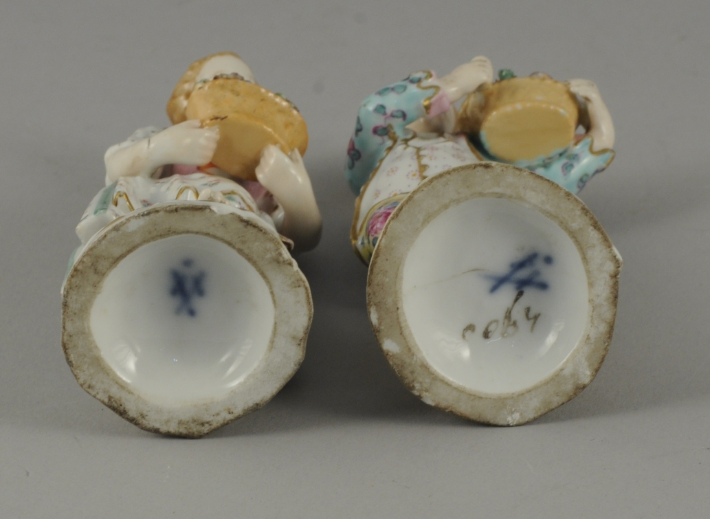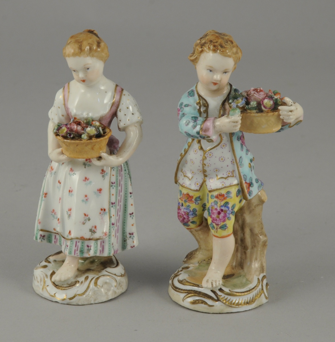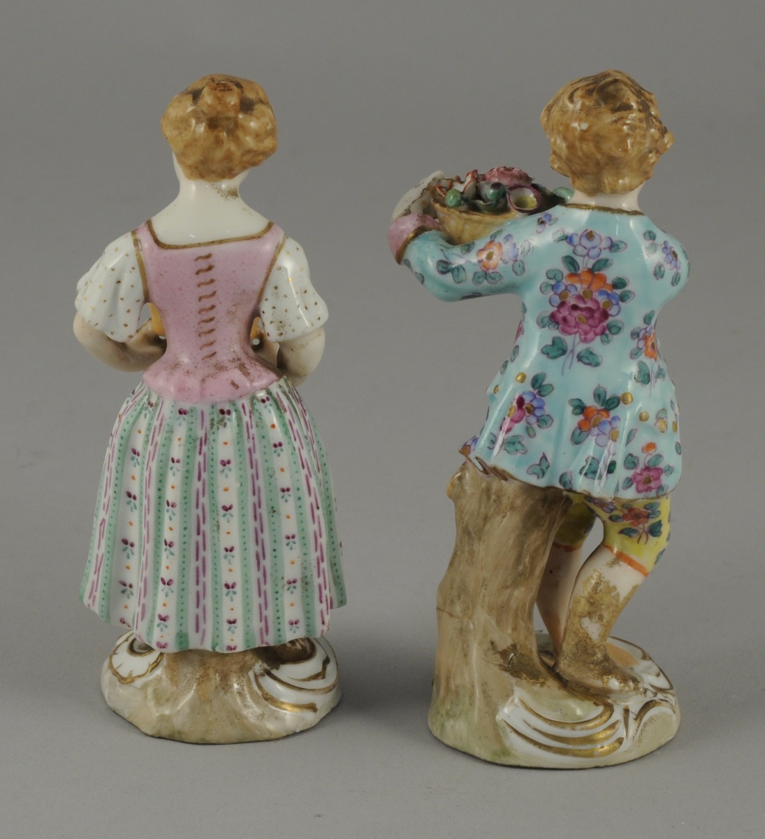 SAXE. DEUX SUJETS en porcelaine polychrome représentant un vendeur et une vendeuse de fleurs dans le goût de Meissen. Marque apocryphe de Meissen.