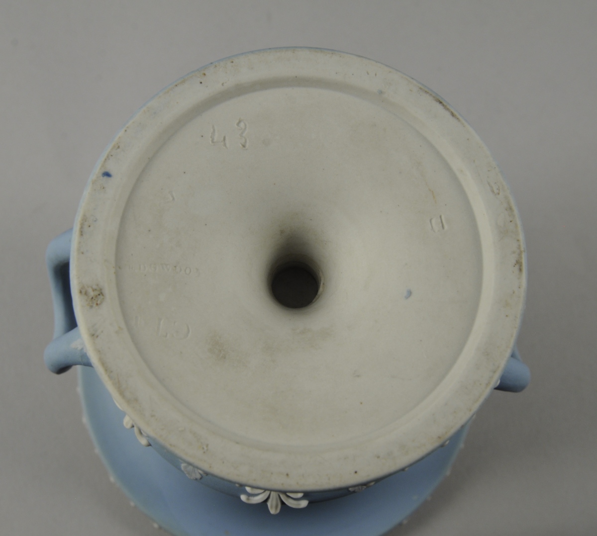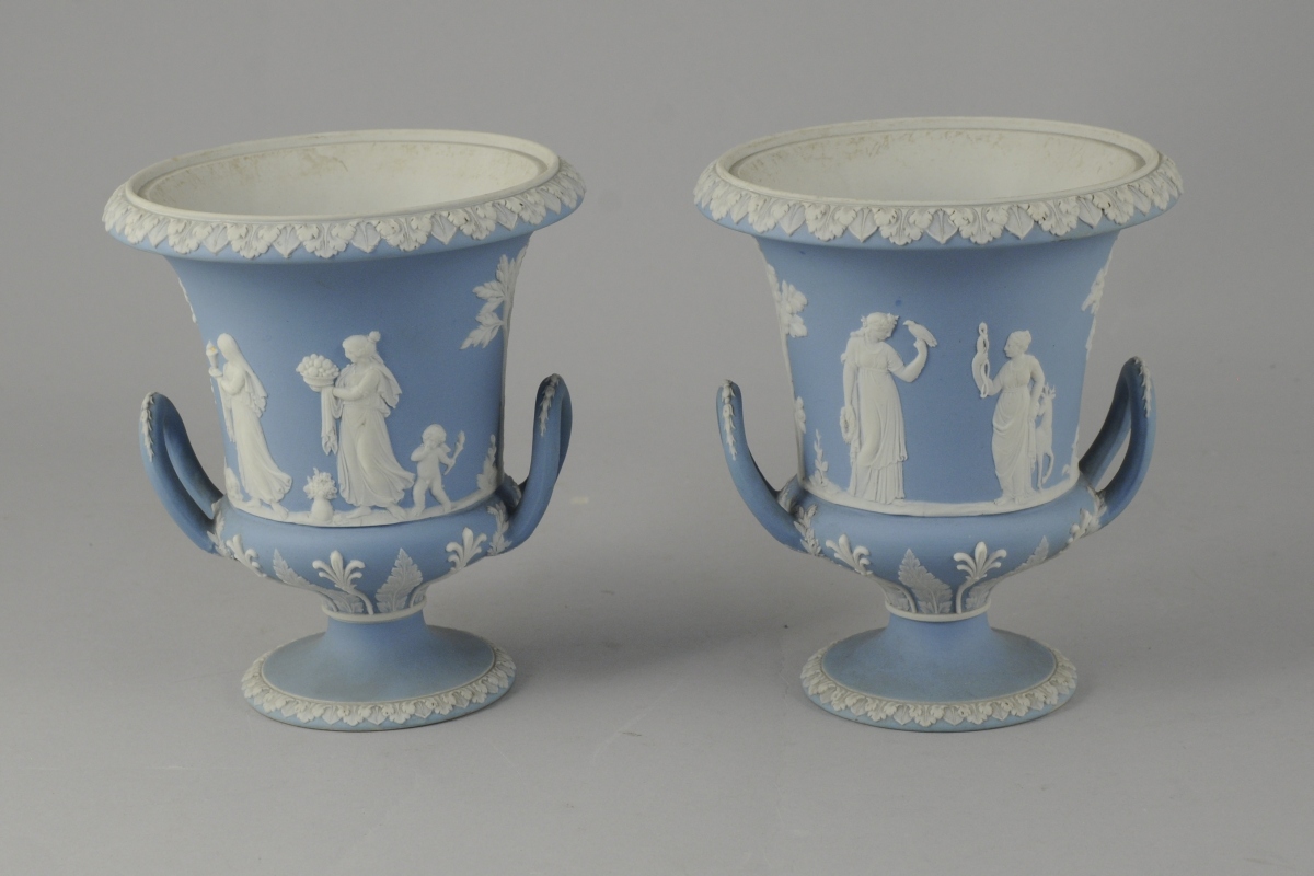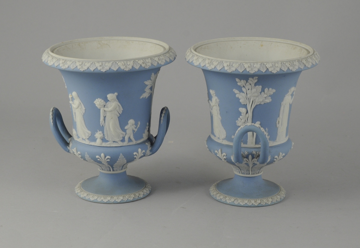 WEDGWOOD. PAIRE DE VASES MÉDICIS. Décor en léger relief en biscuit sur fond bleu pâle de palmes et palmettes et d'une scène circulaire de vestales et d'amours pour l'un et de vestales et d'une Diane chasseresse pour l'autre. Frises de feuilles d'acanthe stylisées sur les bords. Signés.