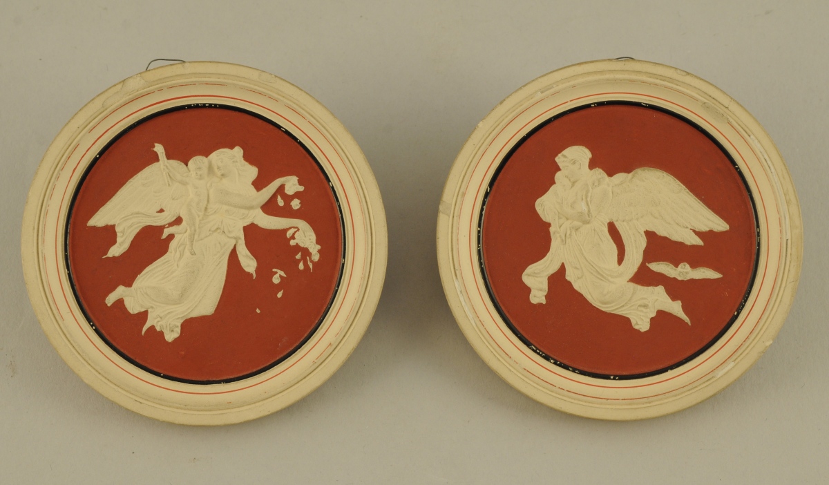 JOINT: PAIRE de MÉDAILLONS à fond rouge dans le goût de Wedgwood. Marqués "P. IPSEN". Travail danois du XIXème. Diam. 9 cm.