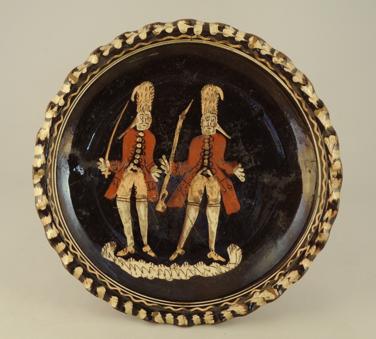 ANGLETERRE? PLAT rond à bord côtelé en terre cuite émaillée et lustrée présentant un décor sur fond brun de deux fantassins en habit rouge et bonnet d'ours. L'un brandit une épée, l'autre un fusil. Filets blancs et vaguelettes sur le marli. Travail ancien probablement anglais. Diam. 33,8 cm.