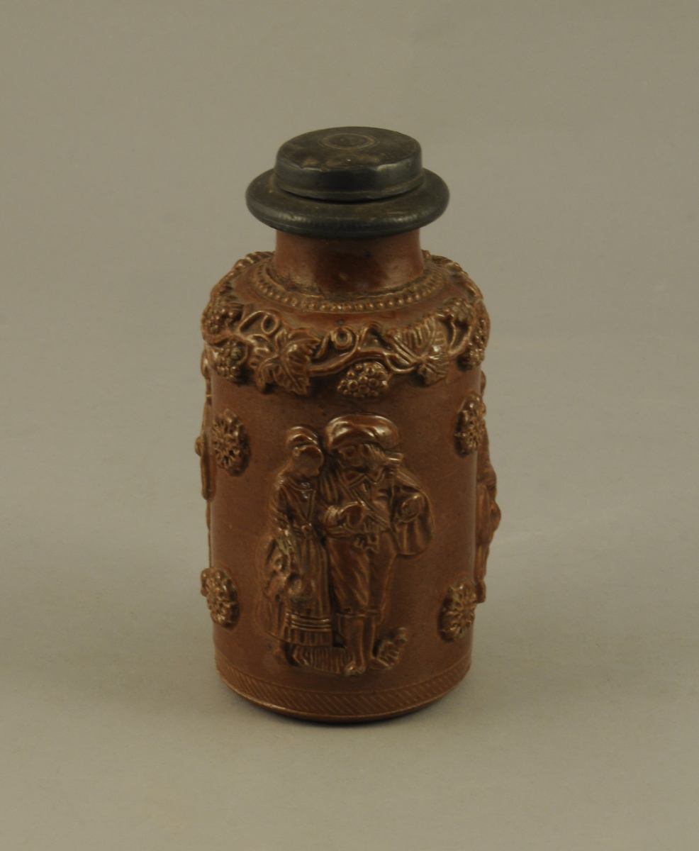 BEAUVAISIE. FLACON en grès vernissé marron. Décor de trois couples de paysans, de pampres, de grappes de raisins, de rosaces, de frises de perles et de torsade. Bouchon en étain.