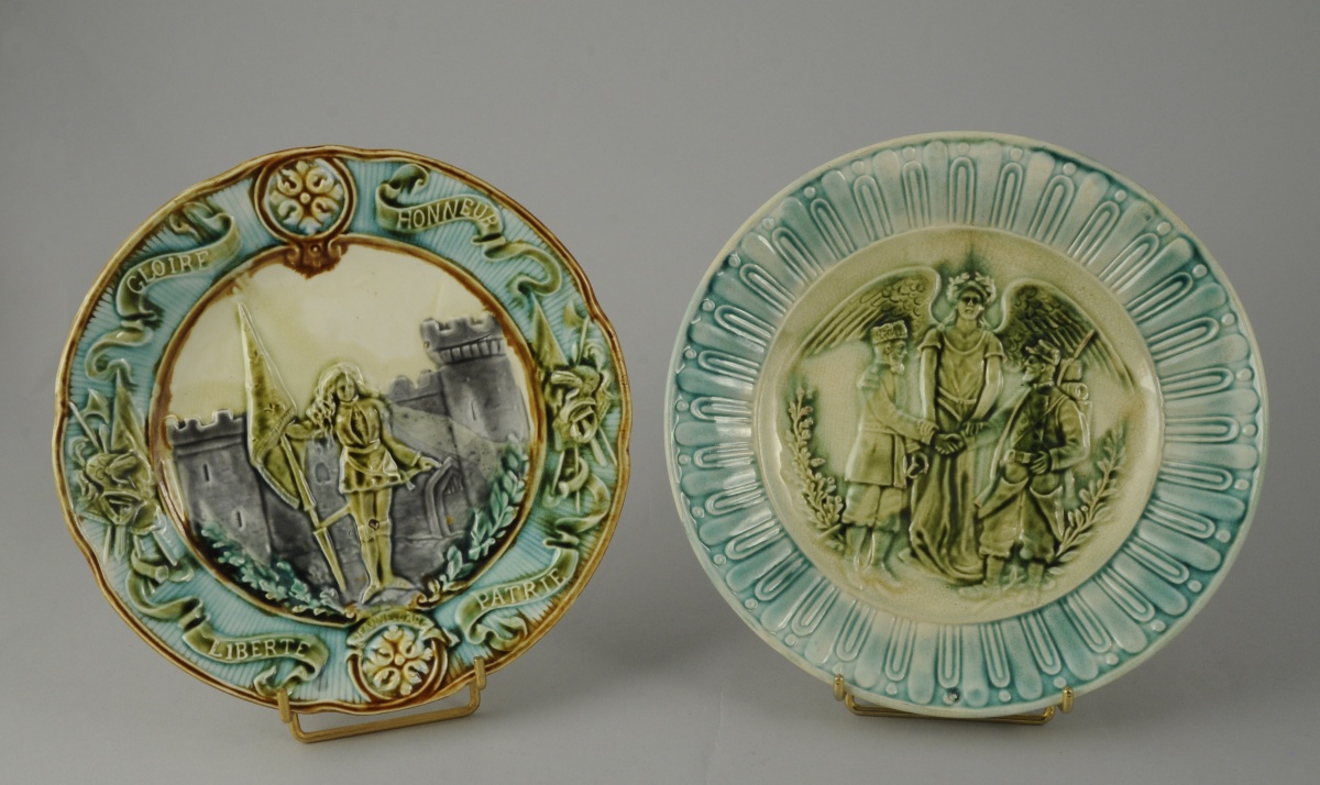- ASSIETTE à bord contourné. Décor polychrome au centre représentant Jeanne d'Arc en armure arborant un étendard fleurdelisé. Elle se tient devant un château médiéval avec, à ses pieds, deux branches de lauriers. Décor polychrome sur l'aile de feuilles d'acanthe dans deux médaillons, l'un surmonté de l'inscription "Jeanne d'Arc", de quatre philactères portant les inscriptions "Honneur / Patrie / Liberté / Gloire" et de deux trophées avec heaume, hache, lance, étendard, épée et bouclier. Marque à l'encre "A." au revers.