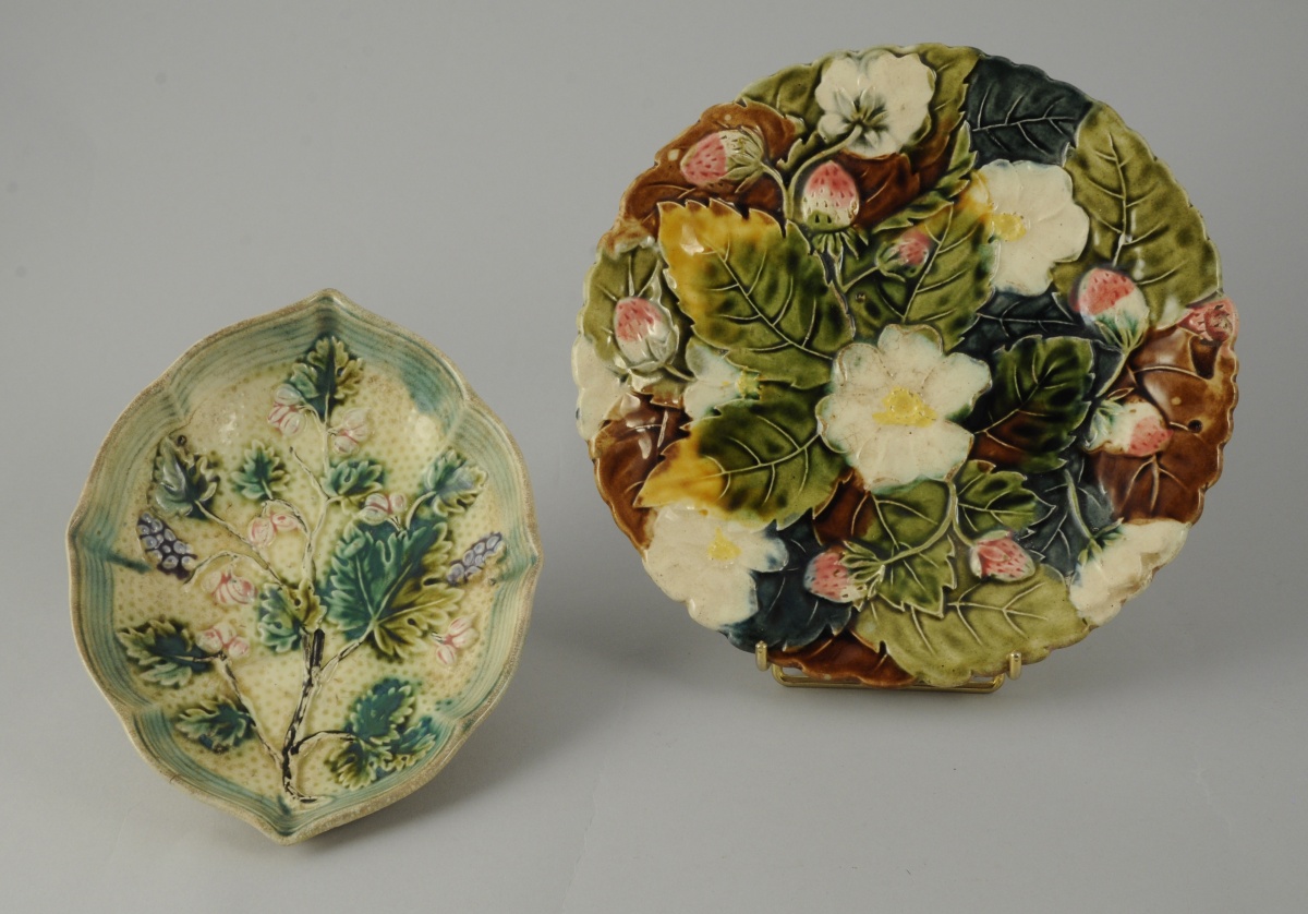 SARREGUEMINES. ASSIETTE en barbotine à bord contourné. Décor polychrome couvrant de fraises et de fleurs et feuilles de fraisier. Marque à l'encre "44" au revers.