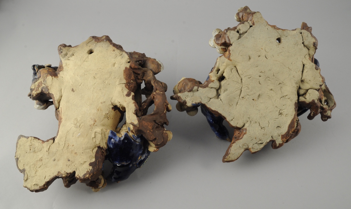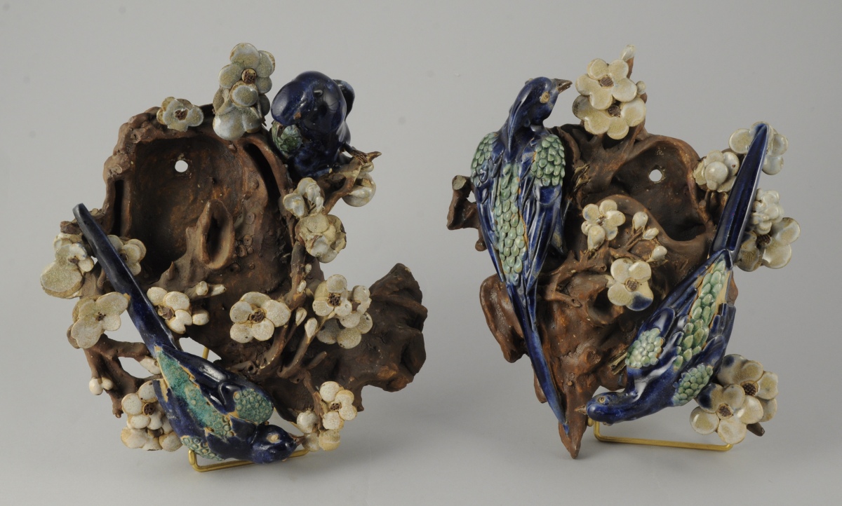 PAIRE DE BOUQUETIÈRES en terre vernissée. Décor polychrome japonisant d'un couple d'oiseaux sur des branches de cerisiers en fleurs.