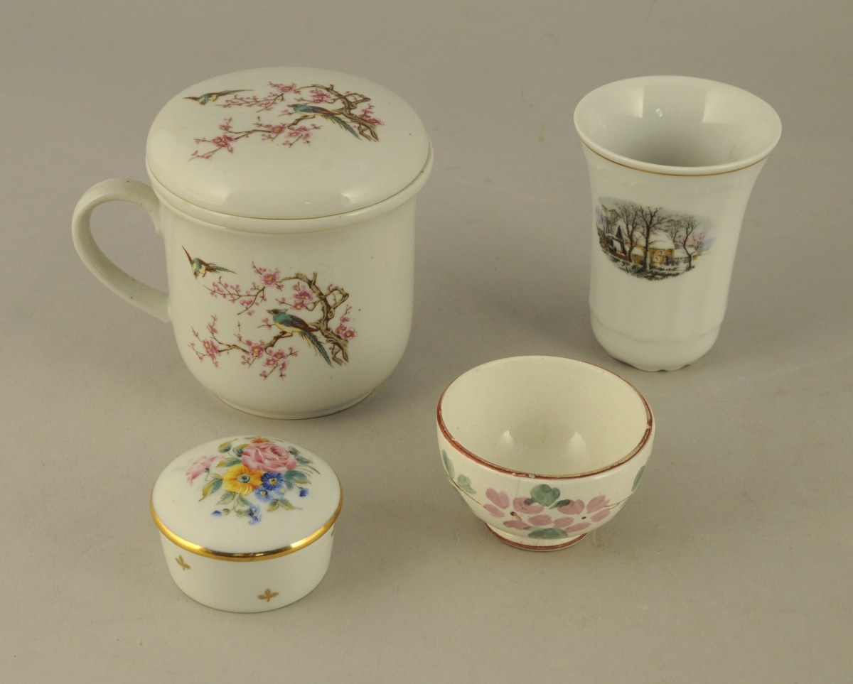 - GOBELET en porcelaine blanche à décor polychrome imprimé d'une vue de ferme sous la neige. Filet or. Haut. 9 cm. Travail Allemand de la fin du XXème. Signé "CROWN-BAVARIA".