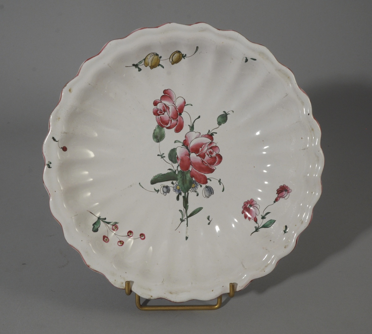 PLAT rond creux godronné en faïence. Décor polychrome au centre d'un bouquet de roses et marguerites. Jetés de fleurs sur l'aile. Filet rose sur le bord.