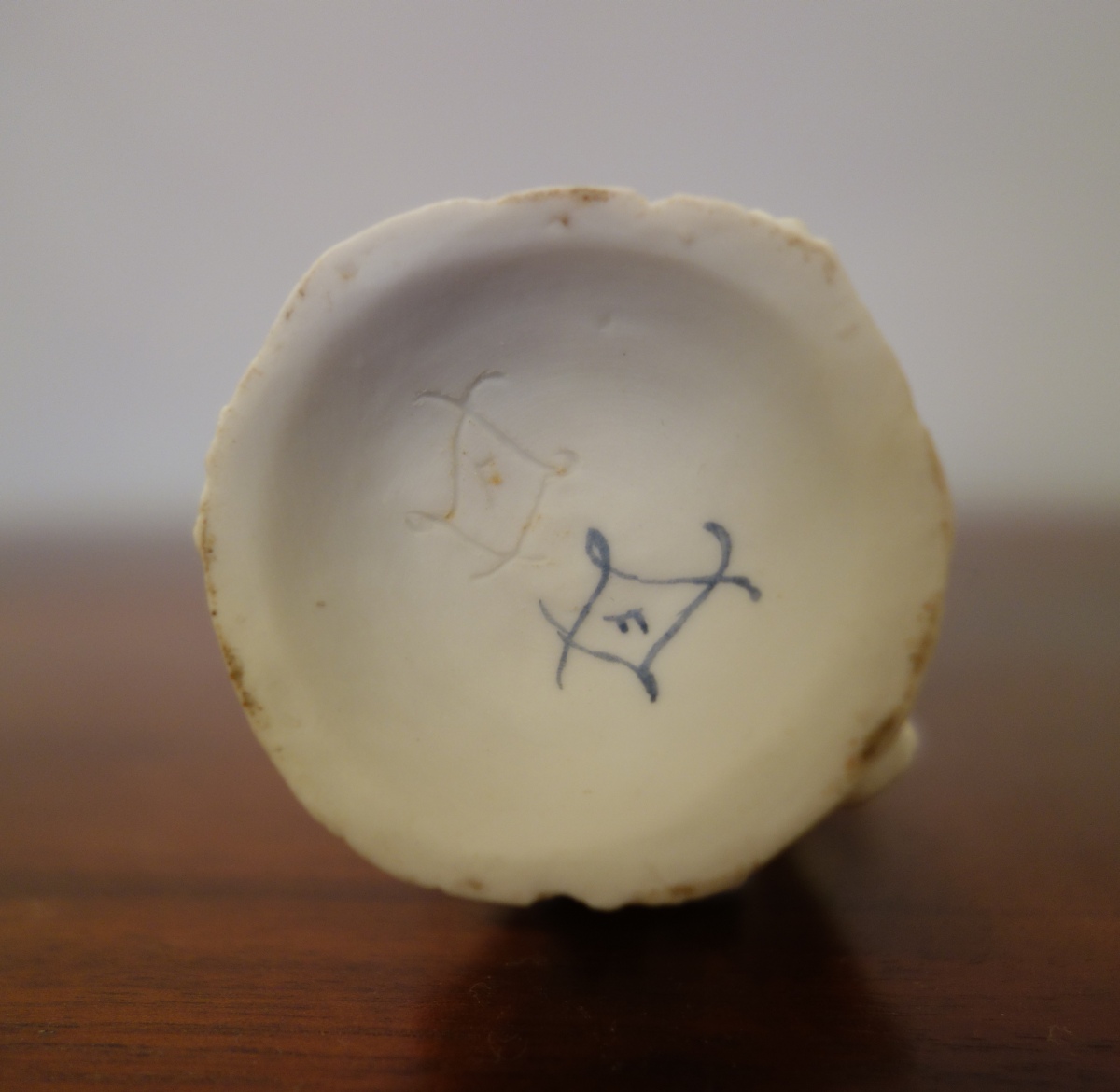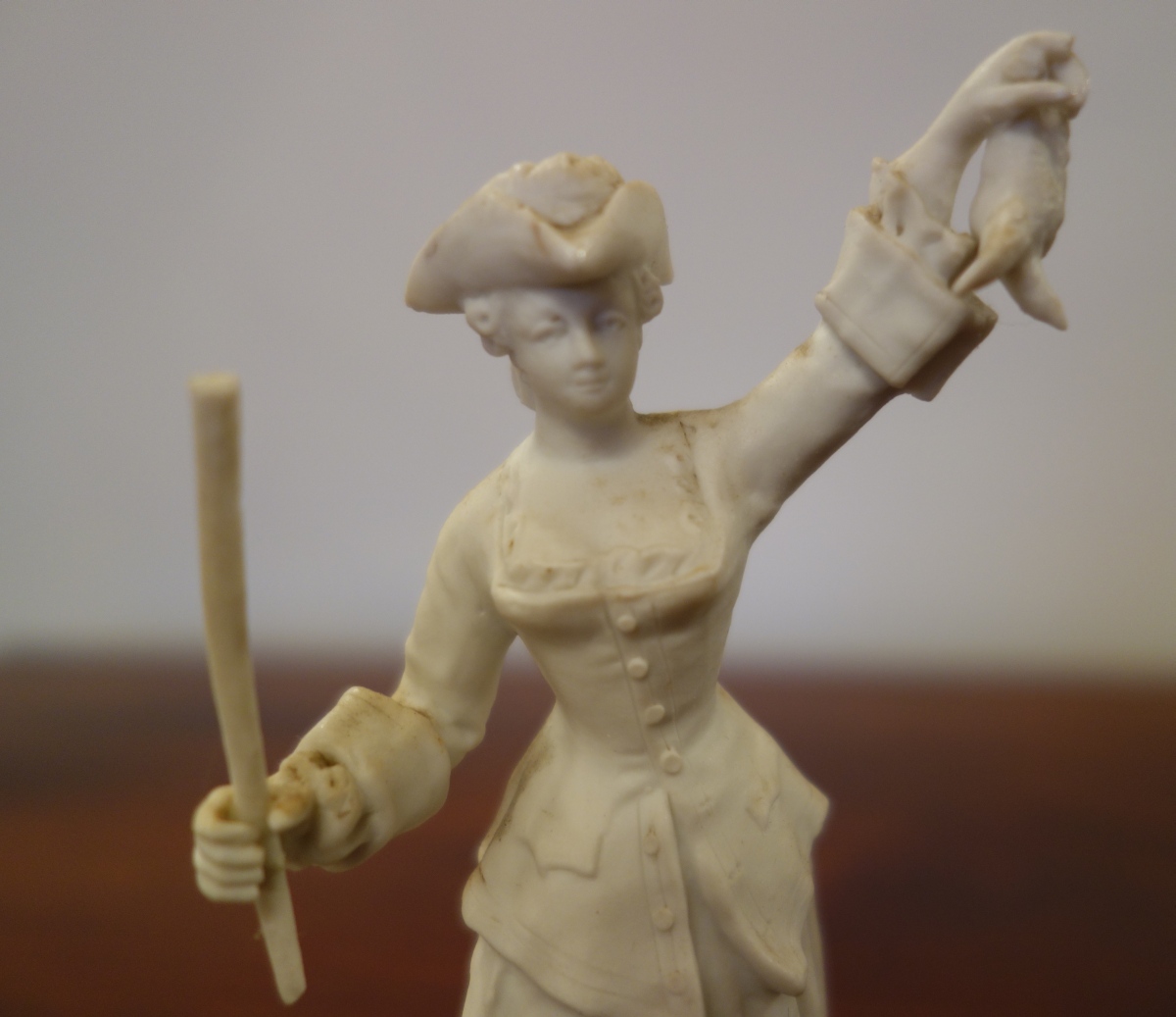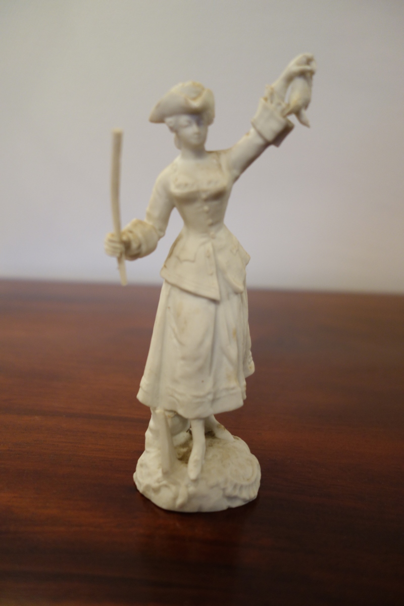 SÈVRES (?). CHASSEUSE À L'OISEAU. Figurine en biscuit. Double signature de Sèvres, une olographe, l'autre dans le biscuit avec la lettre date "F" pour 1758.