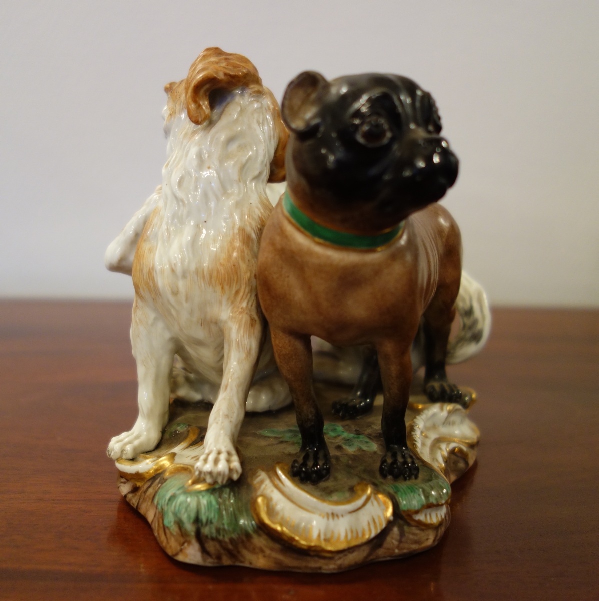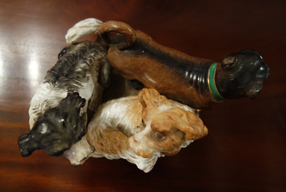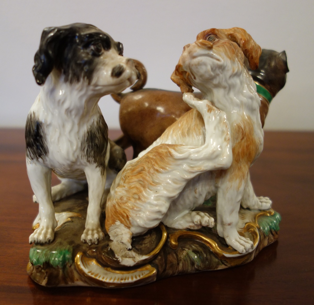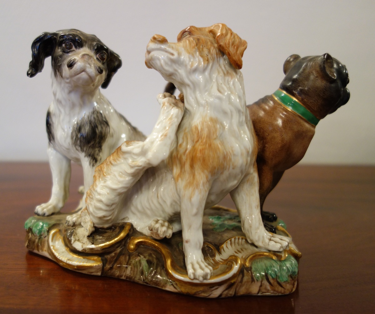 SAMSON dans le goût de MEISSEN (?). TROIS CHIENS. Figurine en porcelaine à décors émaillés au naturel d'un Carlin et de deux Terriers sur une base rocaille dorée. Signature apocryphe de Meissen.