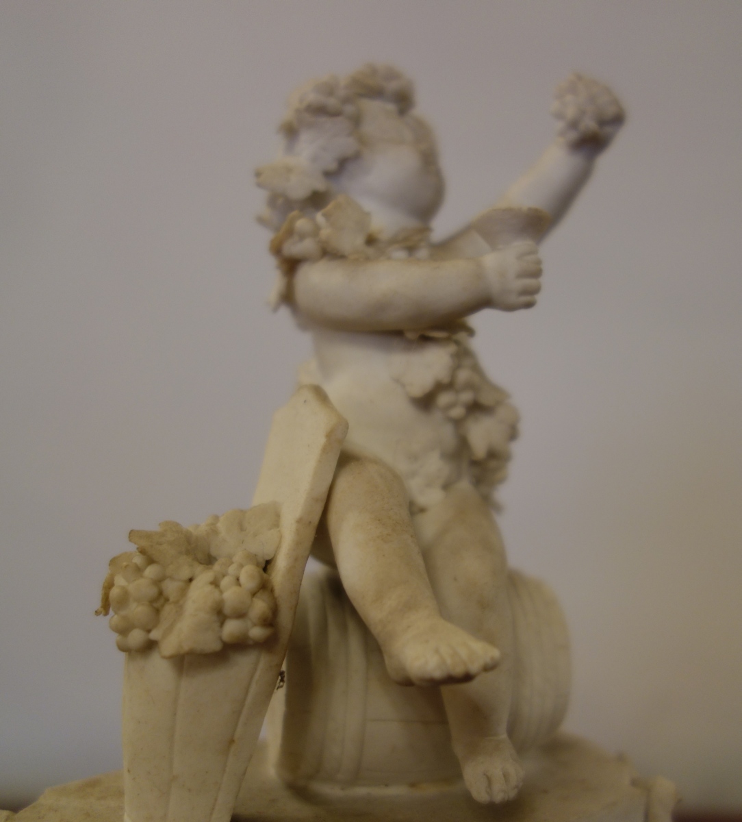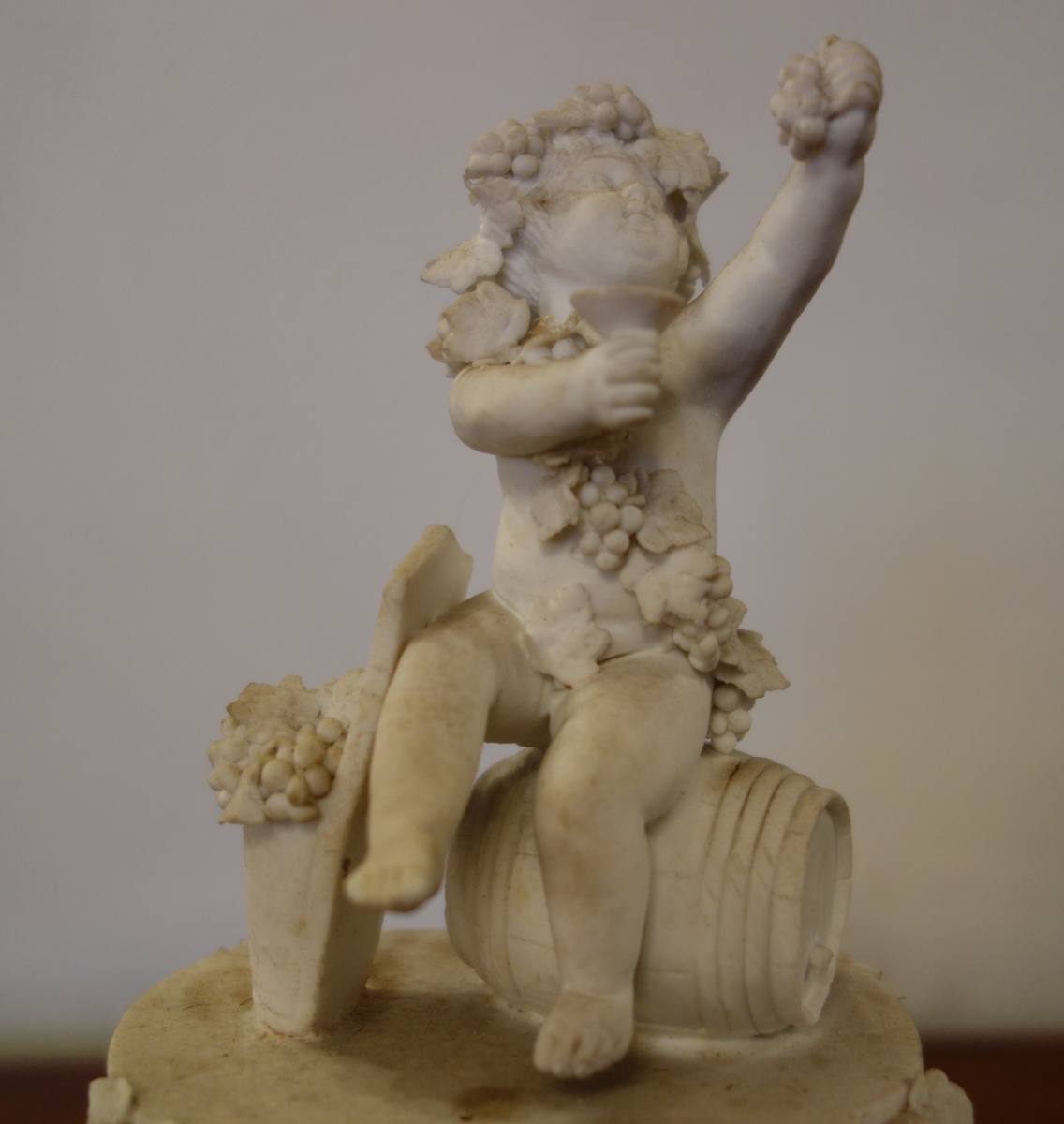 PENDULE BORNE BACHIQUE en biscuit figurant Bachus enfant vendangeur assis sur un tonneau tenant une coupe à la main. Guirlandes et chutes de pampres sur les côtés. Cadran émaillé gradué des minutes, les heures en chiffres arabes, cerclé dans un col en bronze ciselés de perles, entrelacs et frises. Elle repose sur quatre pieds de laiton.
