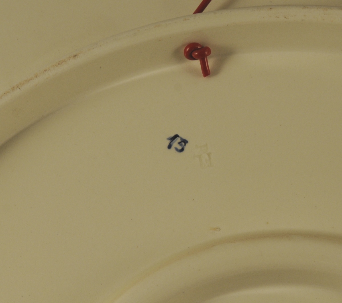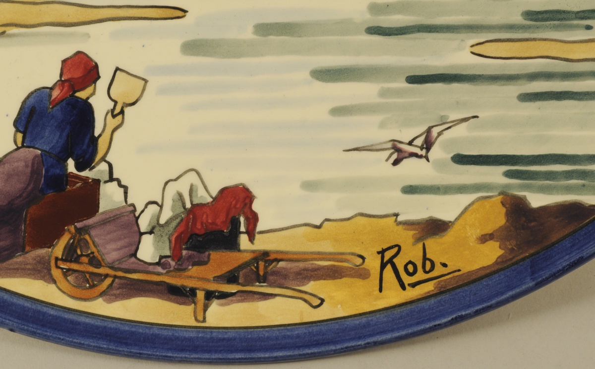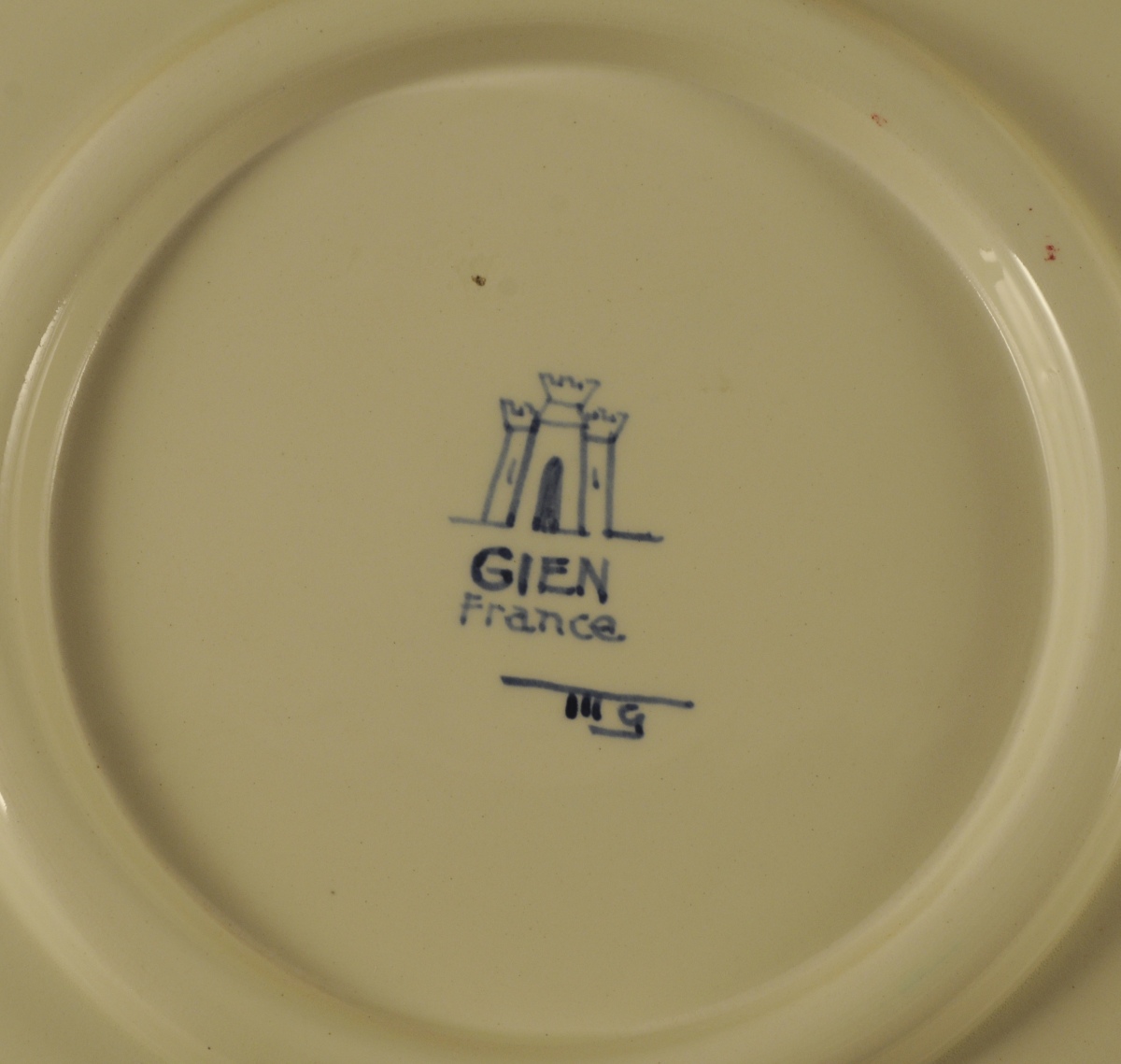 GIEN. GRAND PLAT rond en faïence à décor polychrome d'une vue de Gien et de son ancien pont surmontée des armes de la ville et d'un philactère portant l'inscription "GIEN / 1939". Signé "ROB" dans le décor. Marque à la main de Gien au château pour la période 1941-1950 et marque en creux.