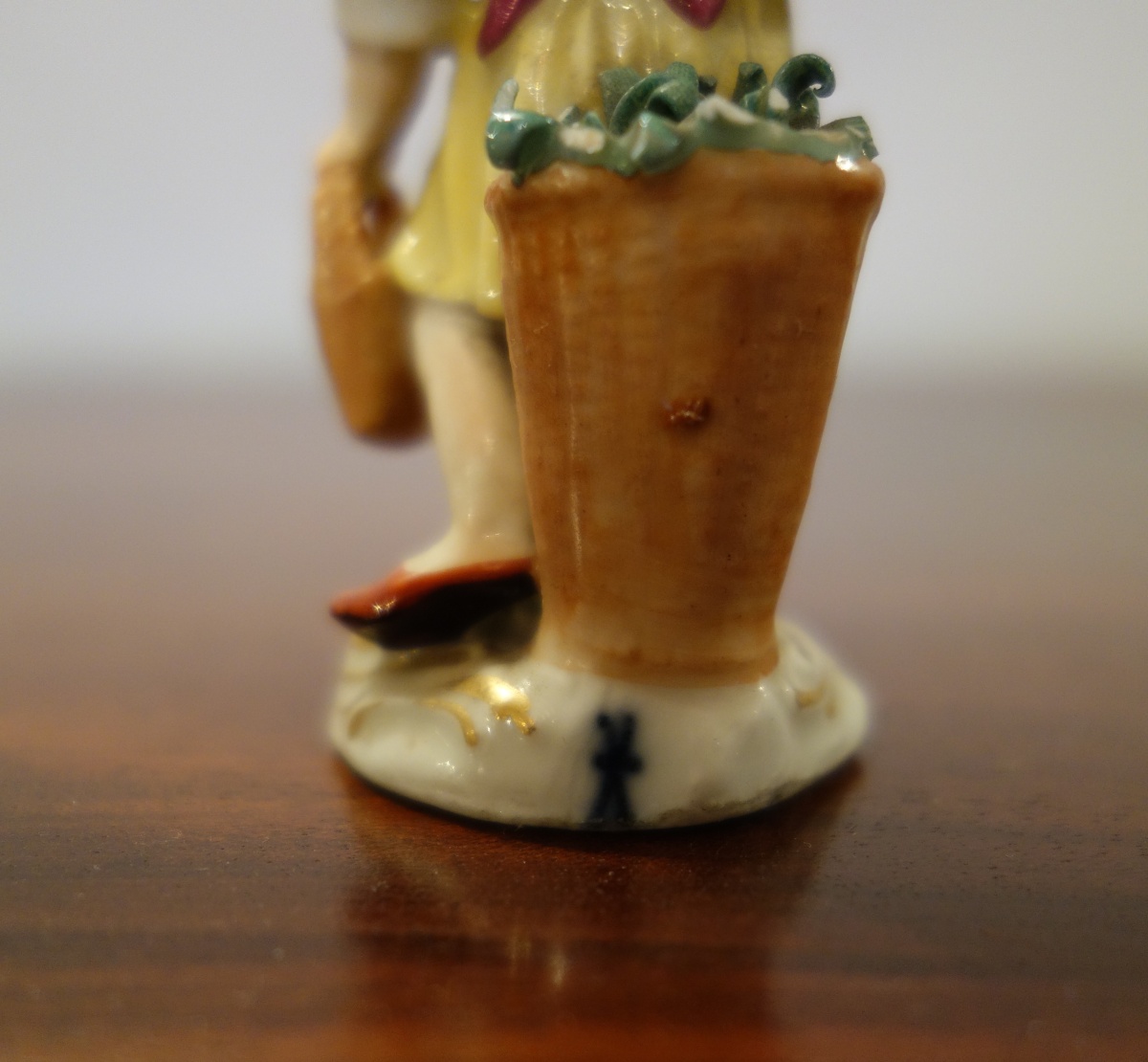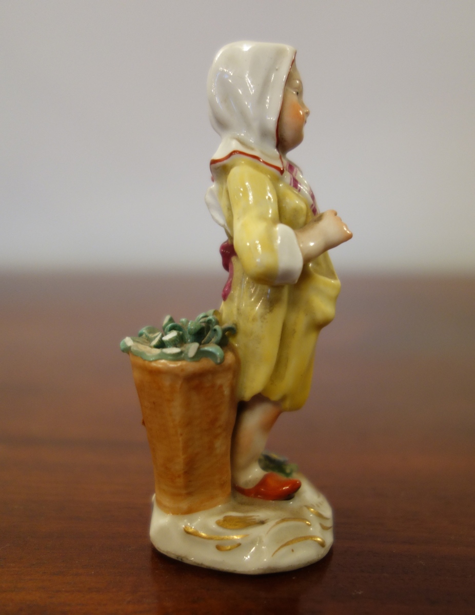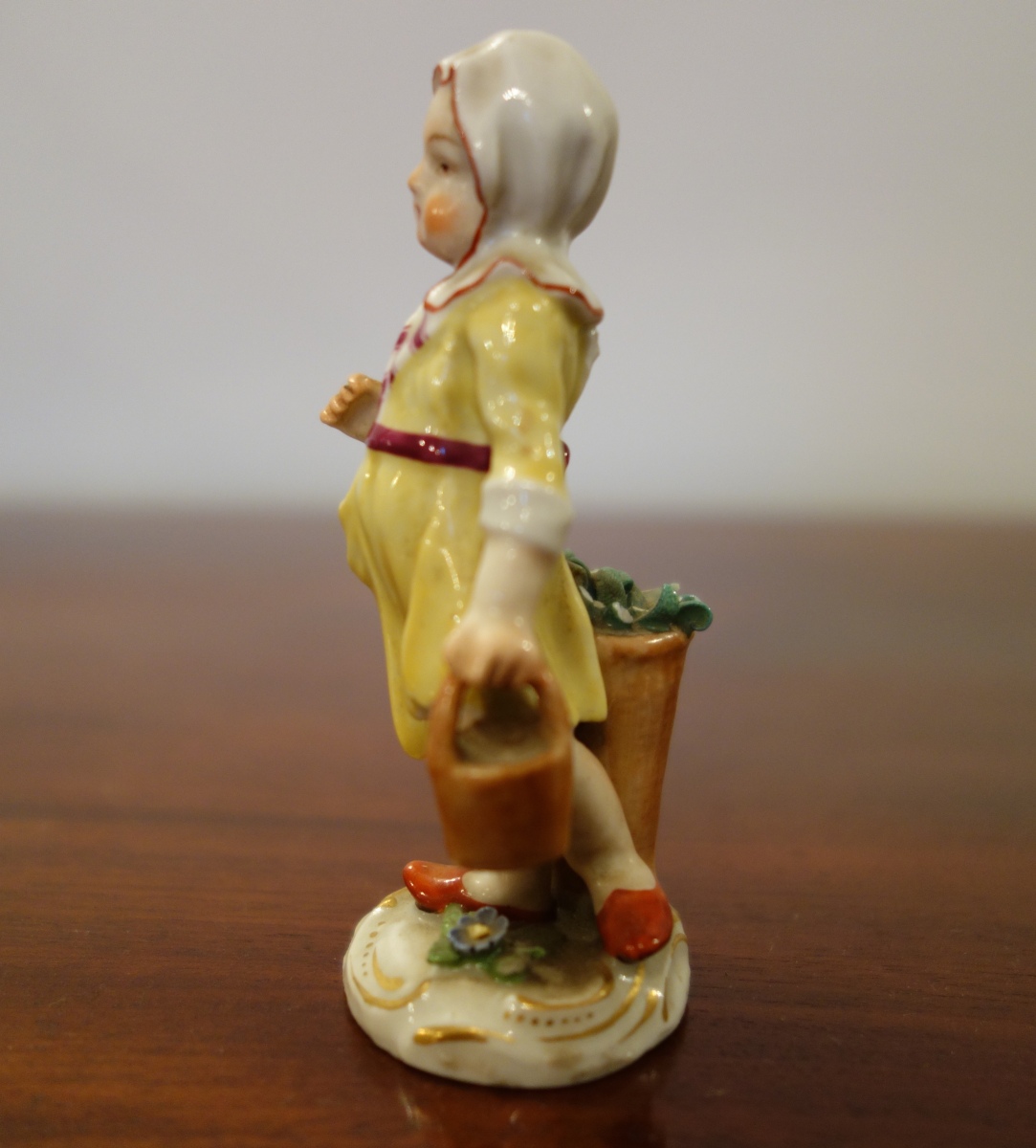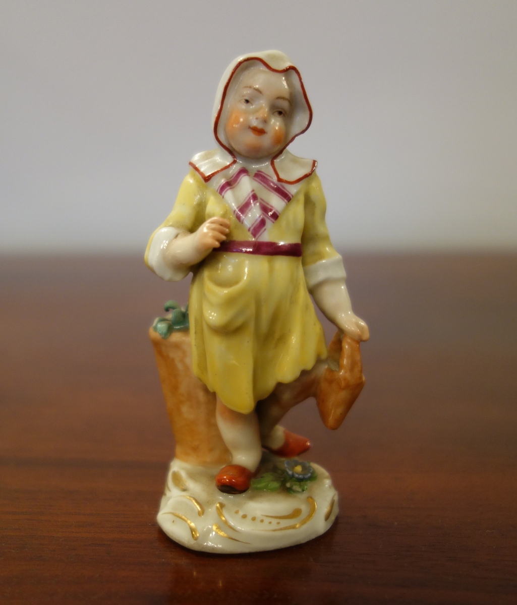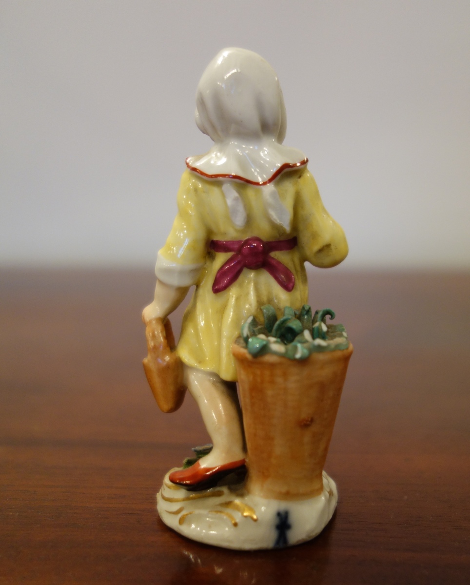 MEISSEN. PETIT CUEILLEUR DE FLEURS. Figurine en porcelaine à décors peint. Signatures aux épées de Meissen sur le côté latéral de la base.