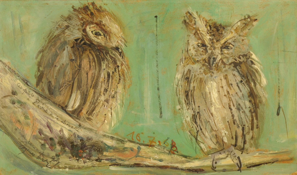 Huile sur isorel, signée en bas à gauche, datée "16.7.68" et dédicacée "Ces petits ducs à l'artiste de la chouette / à mon camarade Goly".