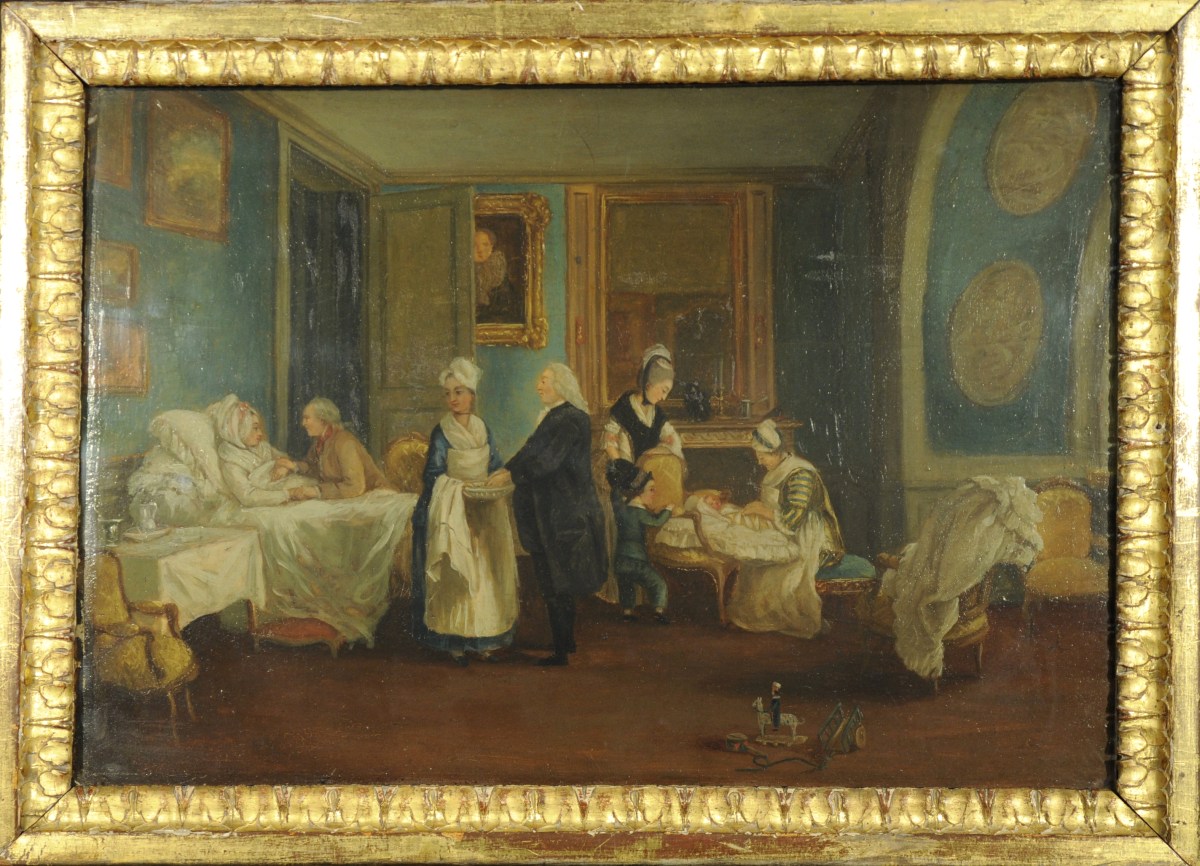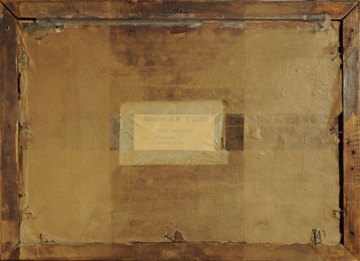 Huile sur panneau. Porte au dos une étiquette: "Collections de Mme C. LELONG / ÉCOLE FRANÇAISE / 534 - L'Accouchée / Cadre en bois sculpté".