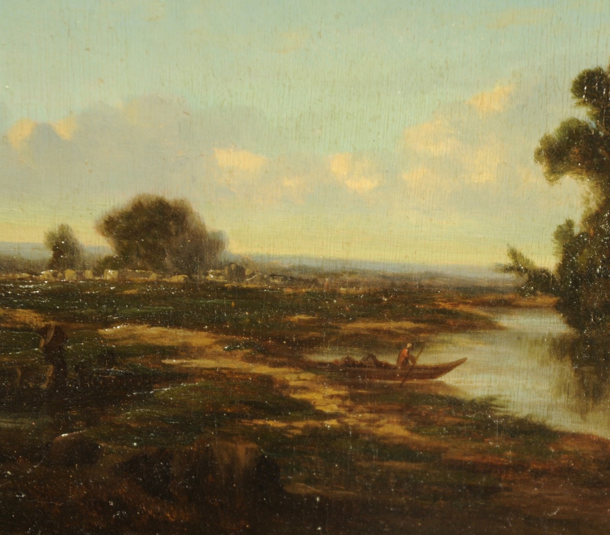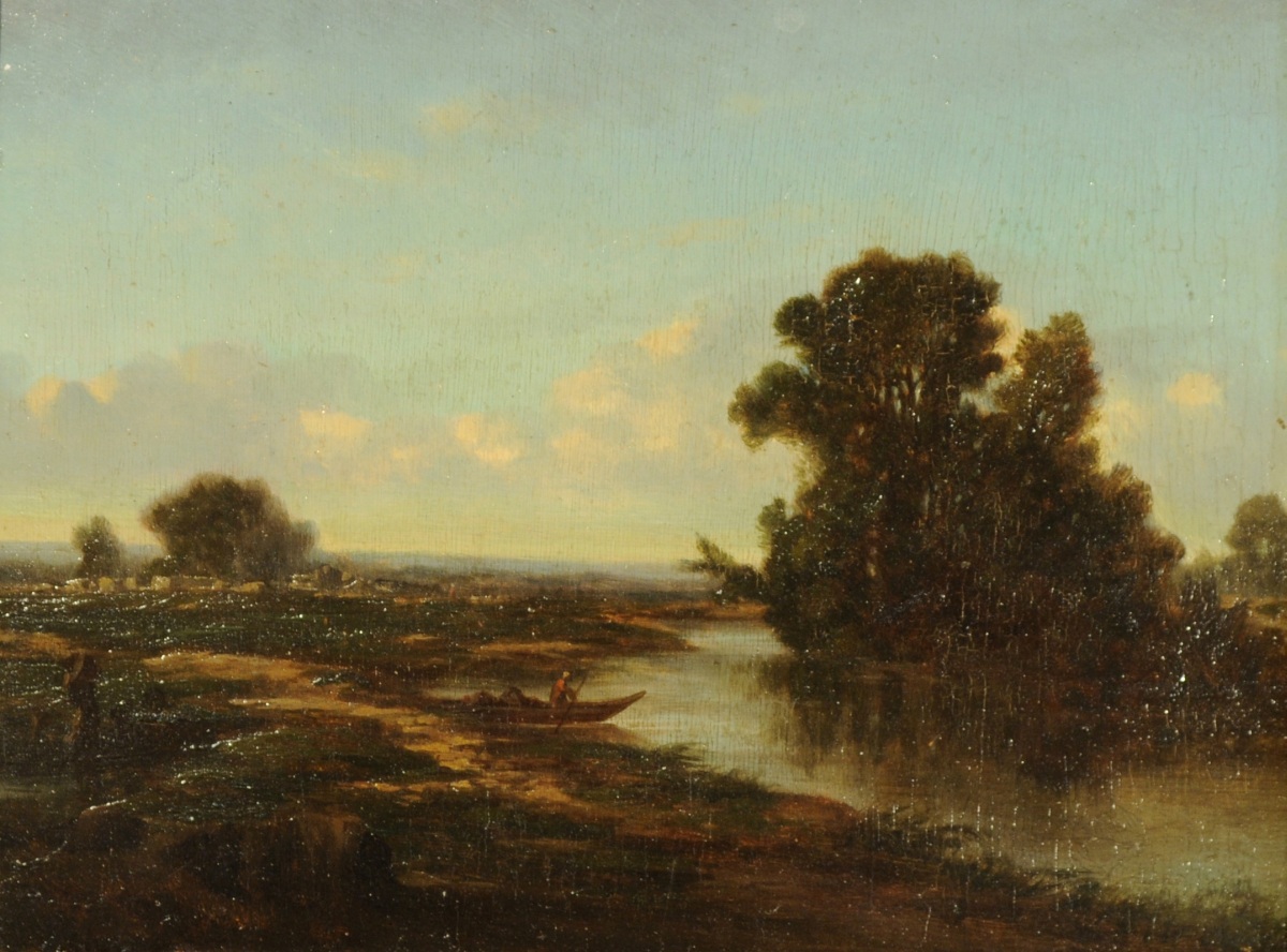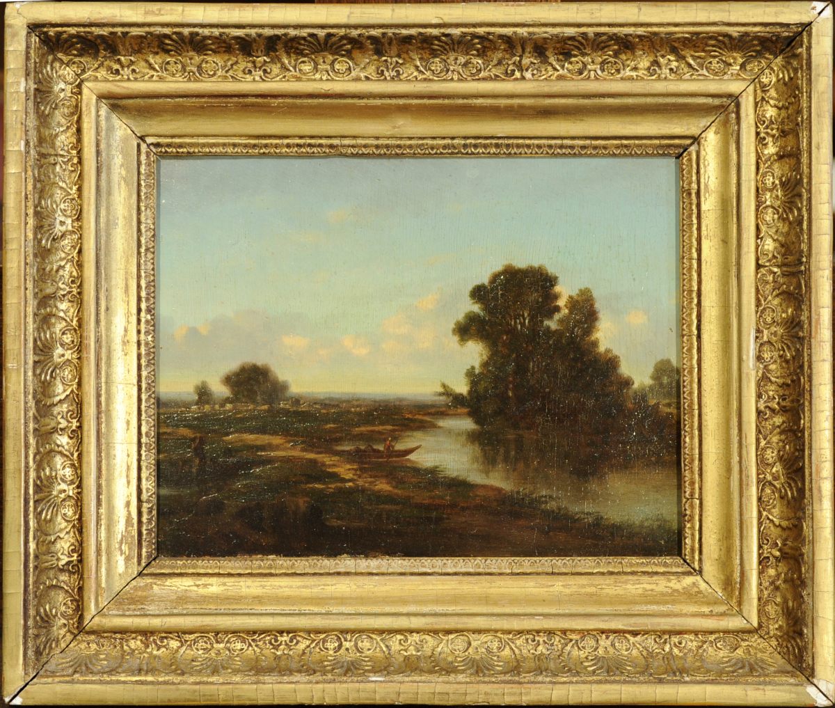 Paysage lacustre animé d'un pêcheur.
