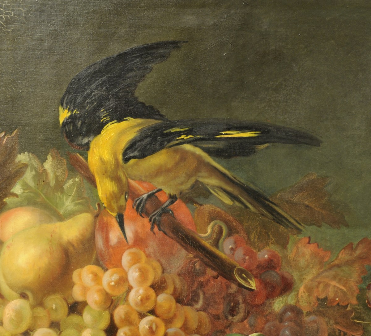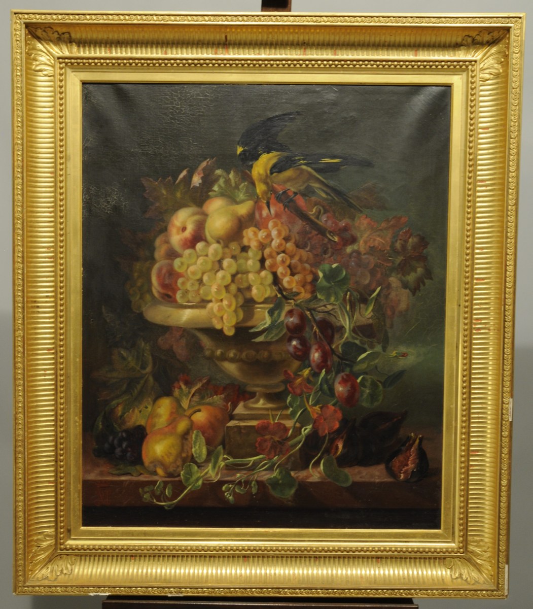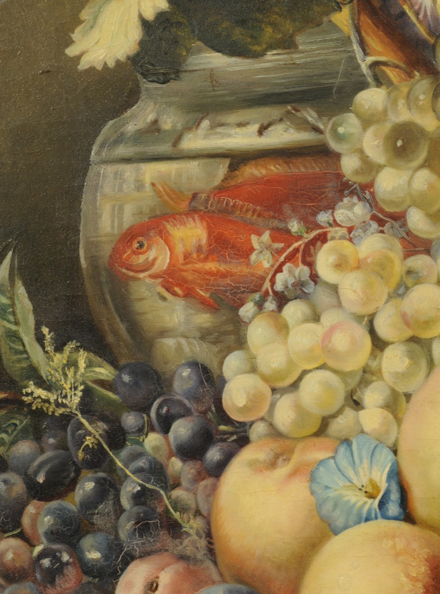 Corbeille de fruits à l'oiseau et bouquet de fleurs et fruits au poisson rouge.