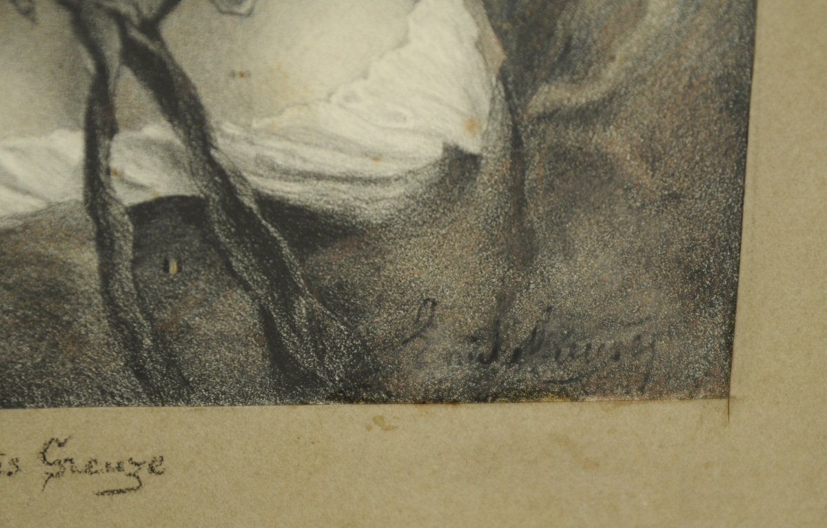 Crayon et rehauts, porte une signature en bas à droite et l'inscription ""Simplicité" d'après Greuze" dans la marie-louise.