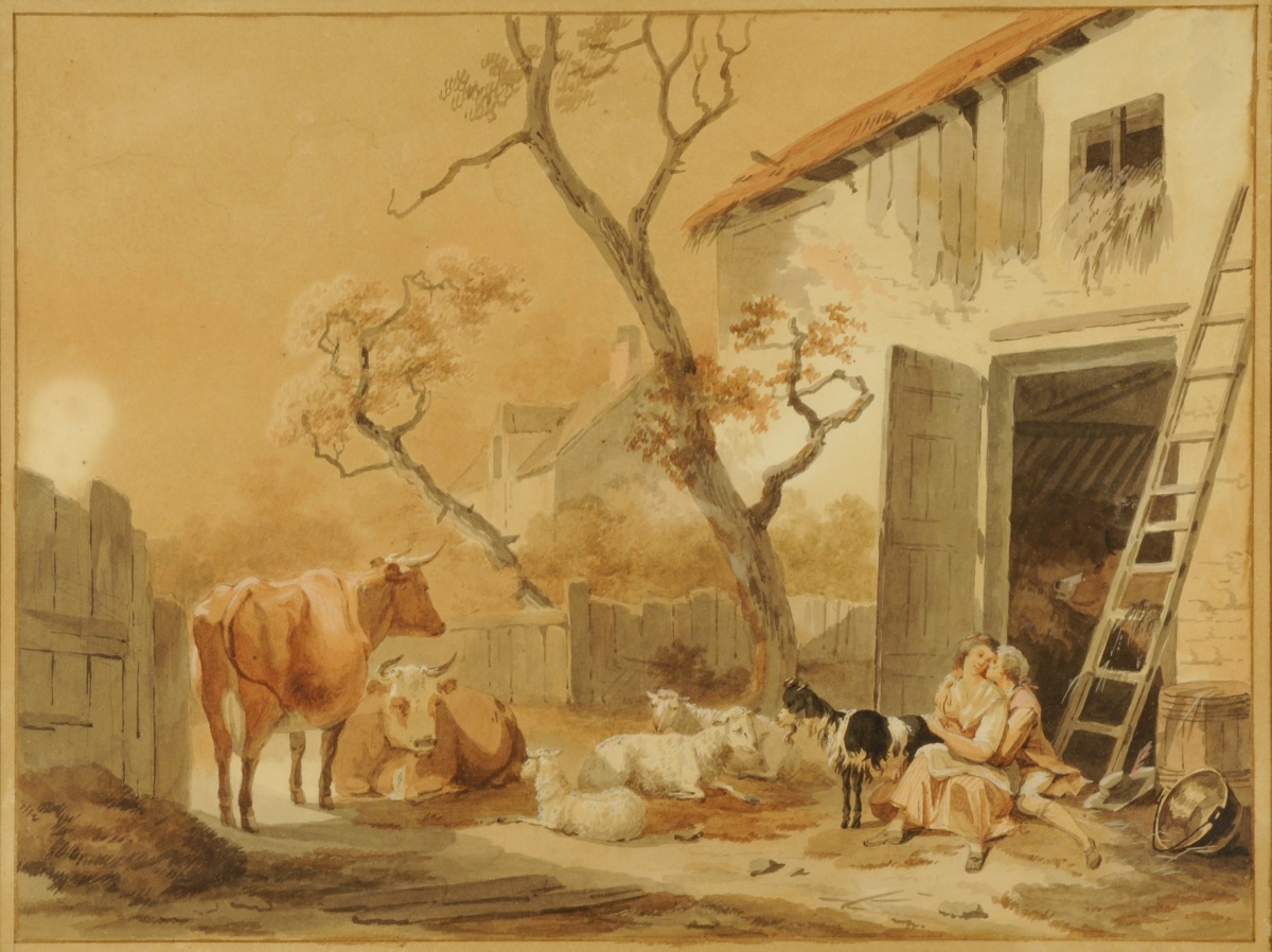 Couple de bergers près d'une étable.