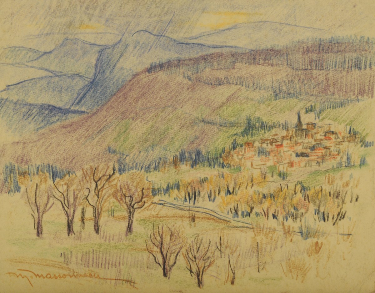 - Vue d'un village dans un paysage de montagnes. Pastel, signé et daté " novembre 1950 " en bas à gauche. 20 x 25,5 cm.