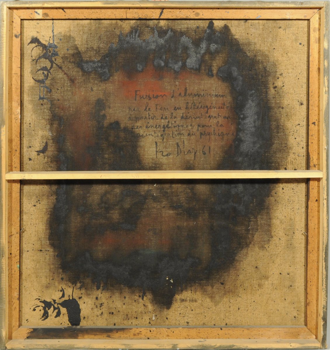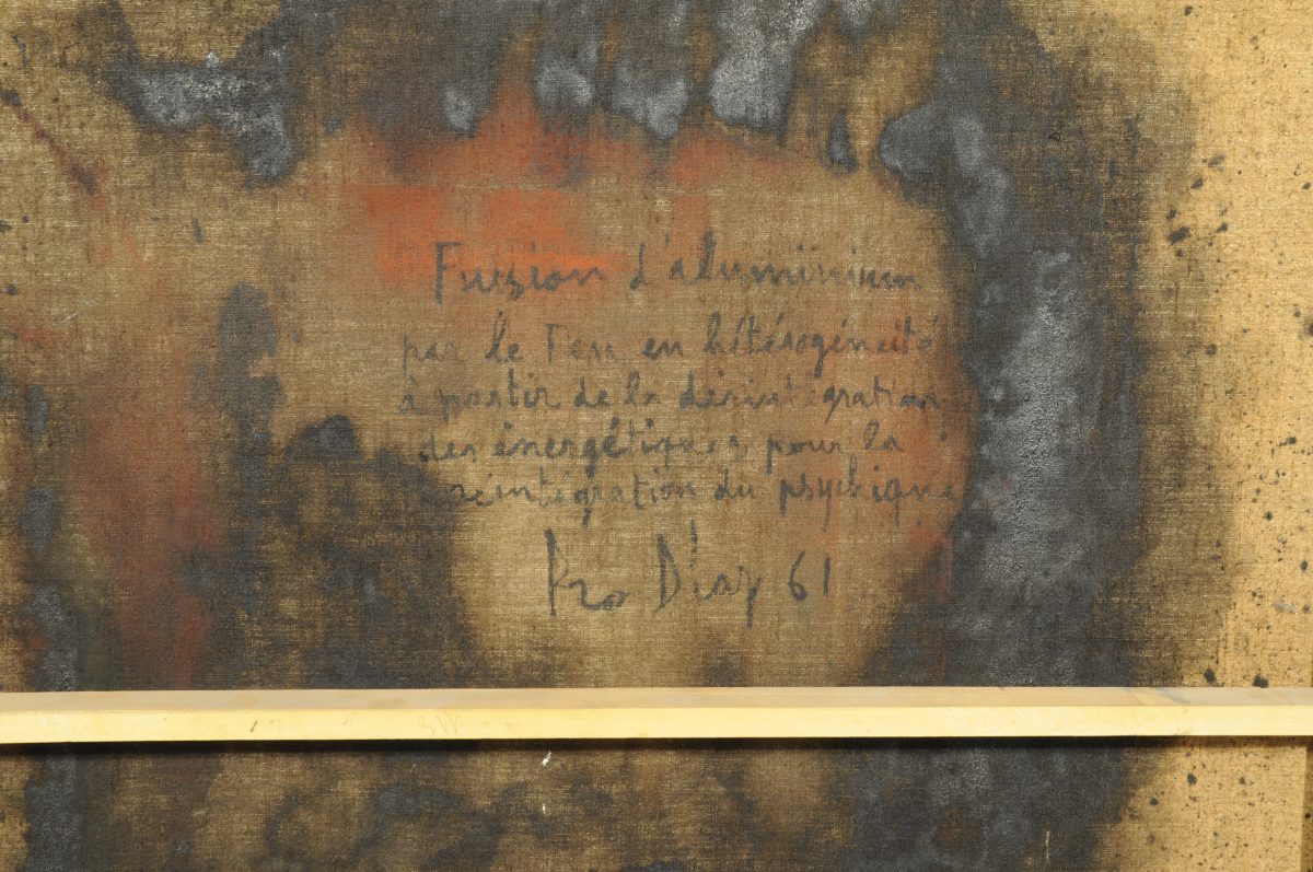 Inscription manuscrite au dos: "Fusion d'aluminium par le feu en hétérogénéité à partir de la désintégration des énergétiques pour la réintégration du psychique".