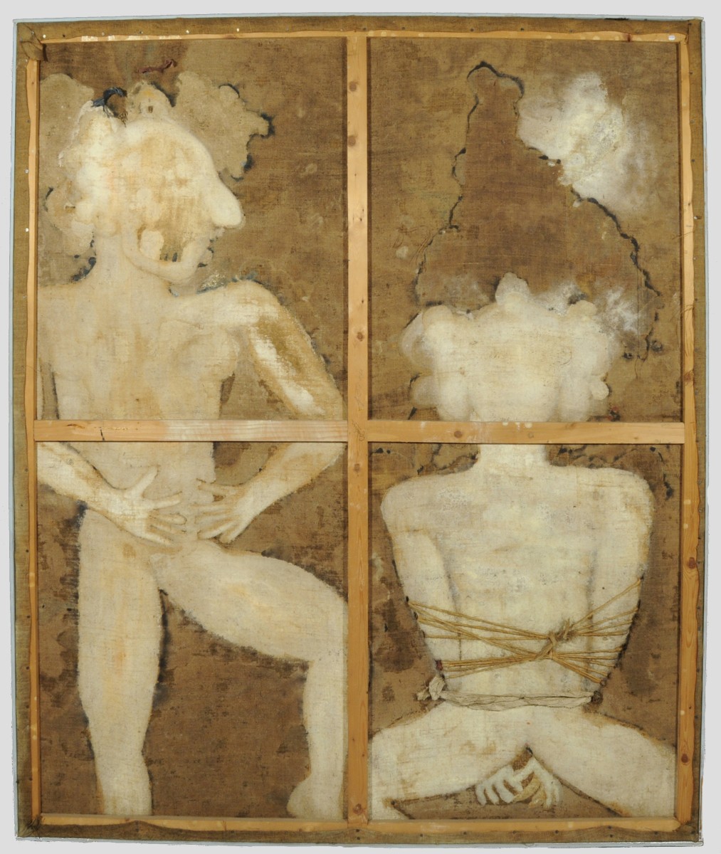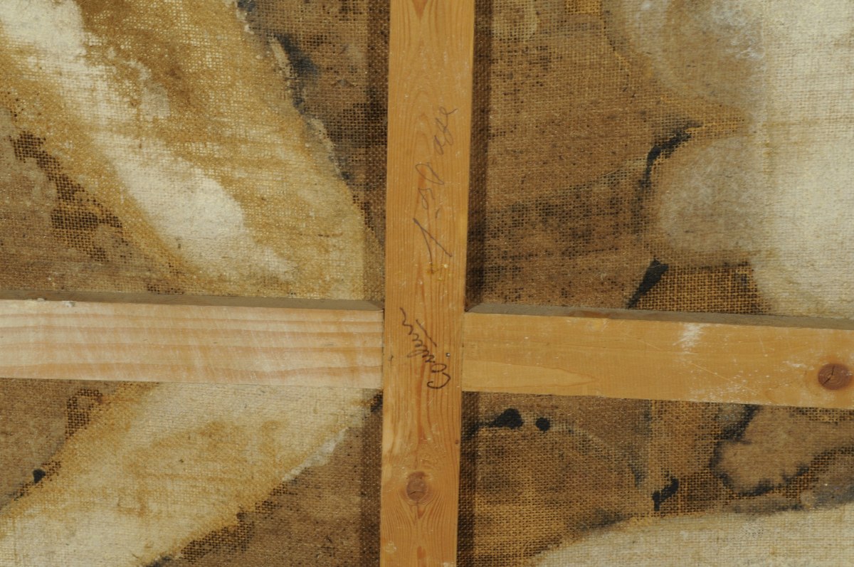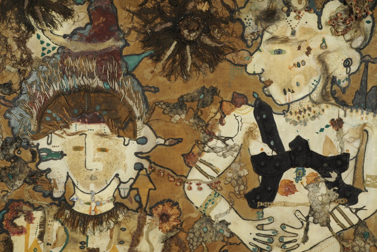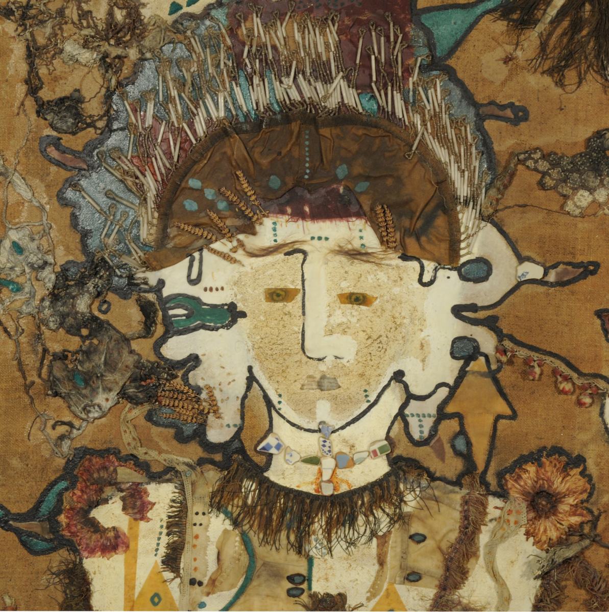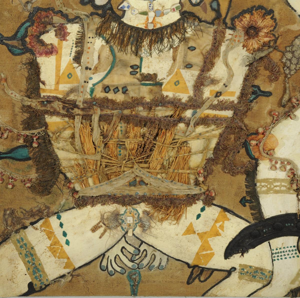 Technique mixte sur toile (collage tissu, végétaux séchés, céramique, peau de reptile, verre, cheveux), monogrammé LV en bas, à droite.