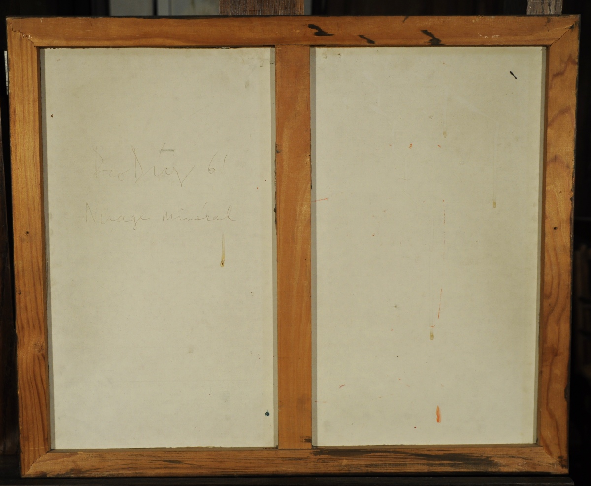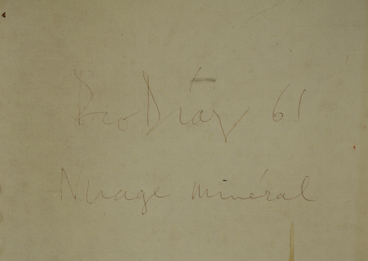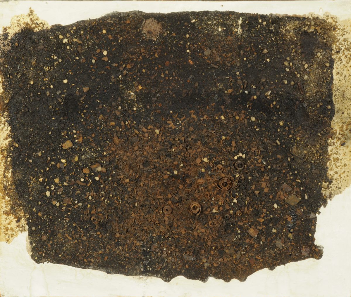Technique mixte avec projection de sable et de particules métalliques sur panneau. Titré et daté "61" au dos.