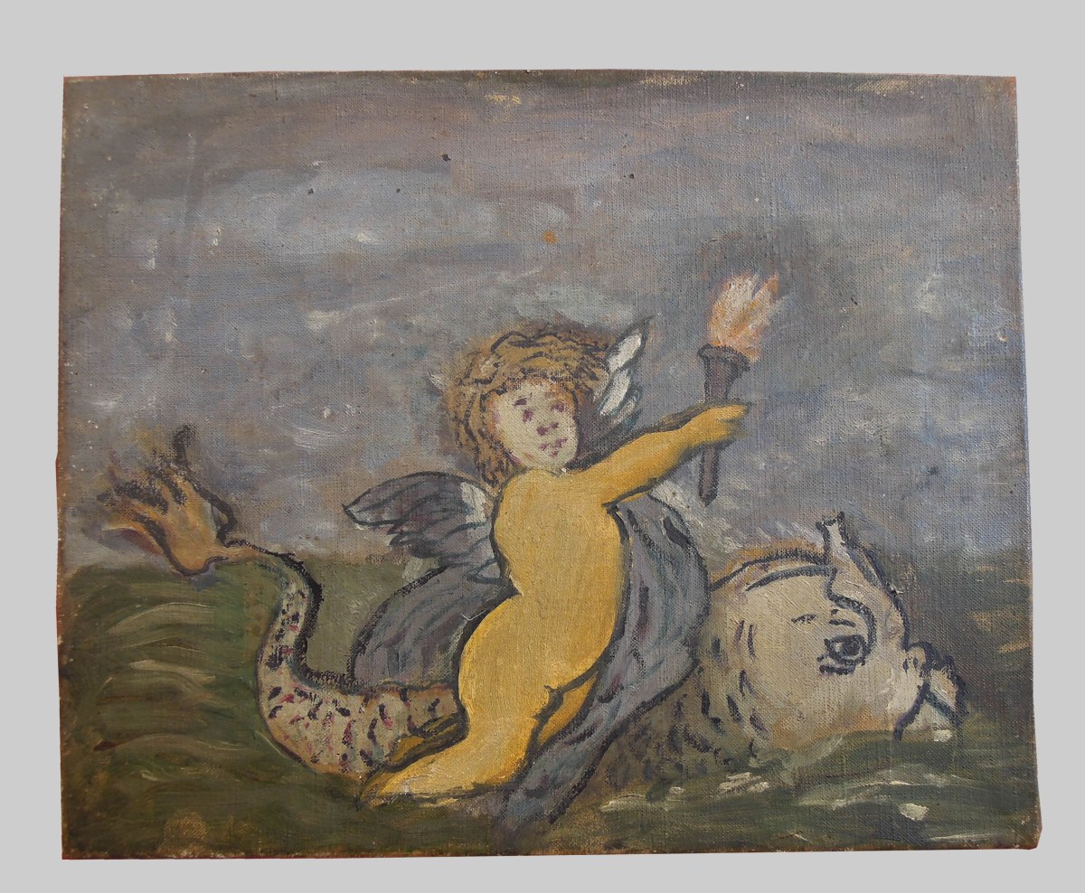 École NAÏVE.Triton et Amour à la torche. Toile. 19 x...