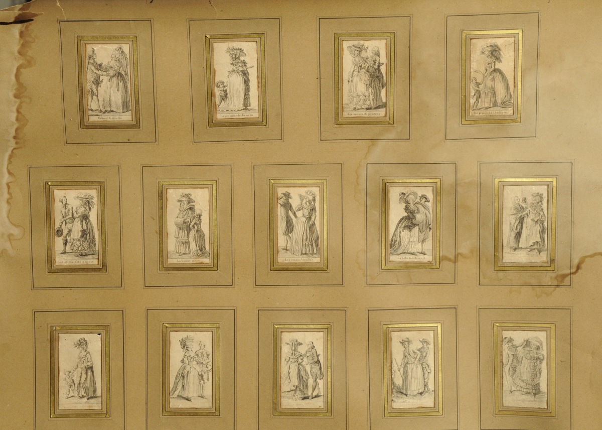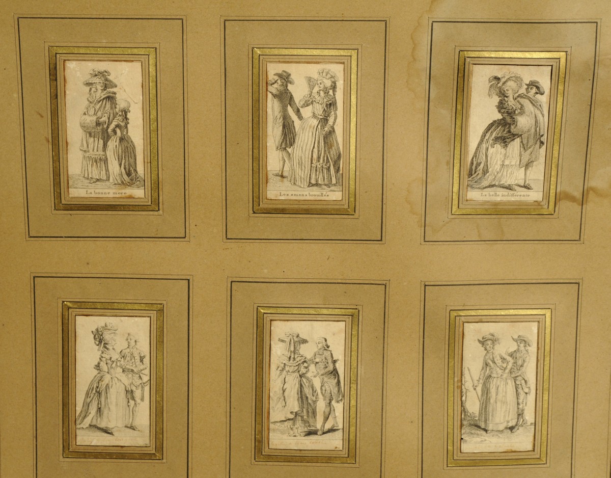 Ensemble de 14 gravures, légendées, entre autres, "L'abord favorable", "Les amans brouillés".