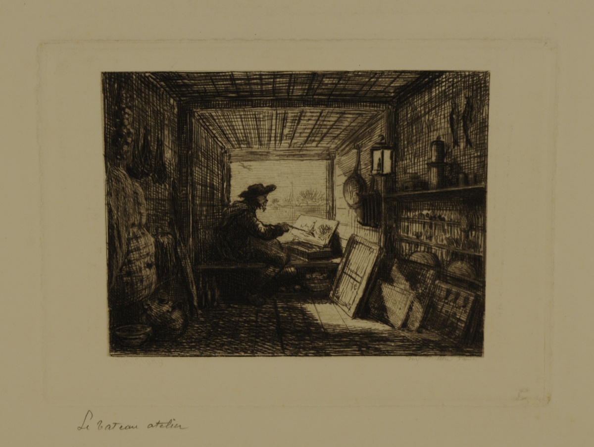 ..."Grâce a ses premiers succès, joints à l'entrée en possession d'un petit héritage, Daubigny put réaliser un rêve révelateur de l'orientation très particulière de sa sensibilité. Il fit construire une péniche, aménagée en vue d'une habitation permanente: c'est à bord du "Bottin" qu'il vivra désormais une existence errante sur les canaux et les rivières, explorant tout le bassin de la Seine, se faisant remorquer et déposer tour à tour au gré de sa fantaisie et de l'attrait des sites. Séjournant sur les eaux dormantes et dans les brouillards humides, Daubigny commença à éprouver de graves symptômes d'épuisement..." E. Bénezit, vol. 4, p.261.