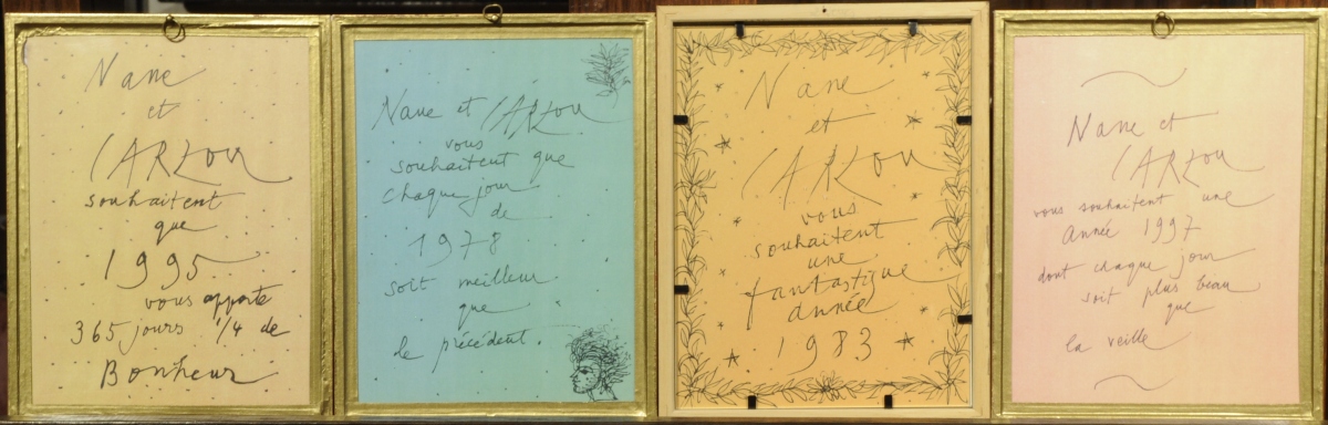 Trois lithographies et une épreuve d'artiste en couleurs, numérotées 272/500, 67/410 et 165/307. Conçues telles des cartes de voeux pour les années 78,83,95 et 97.