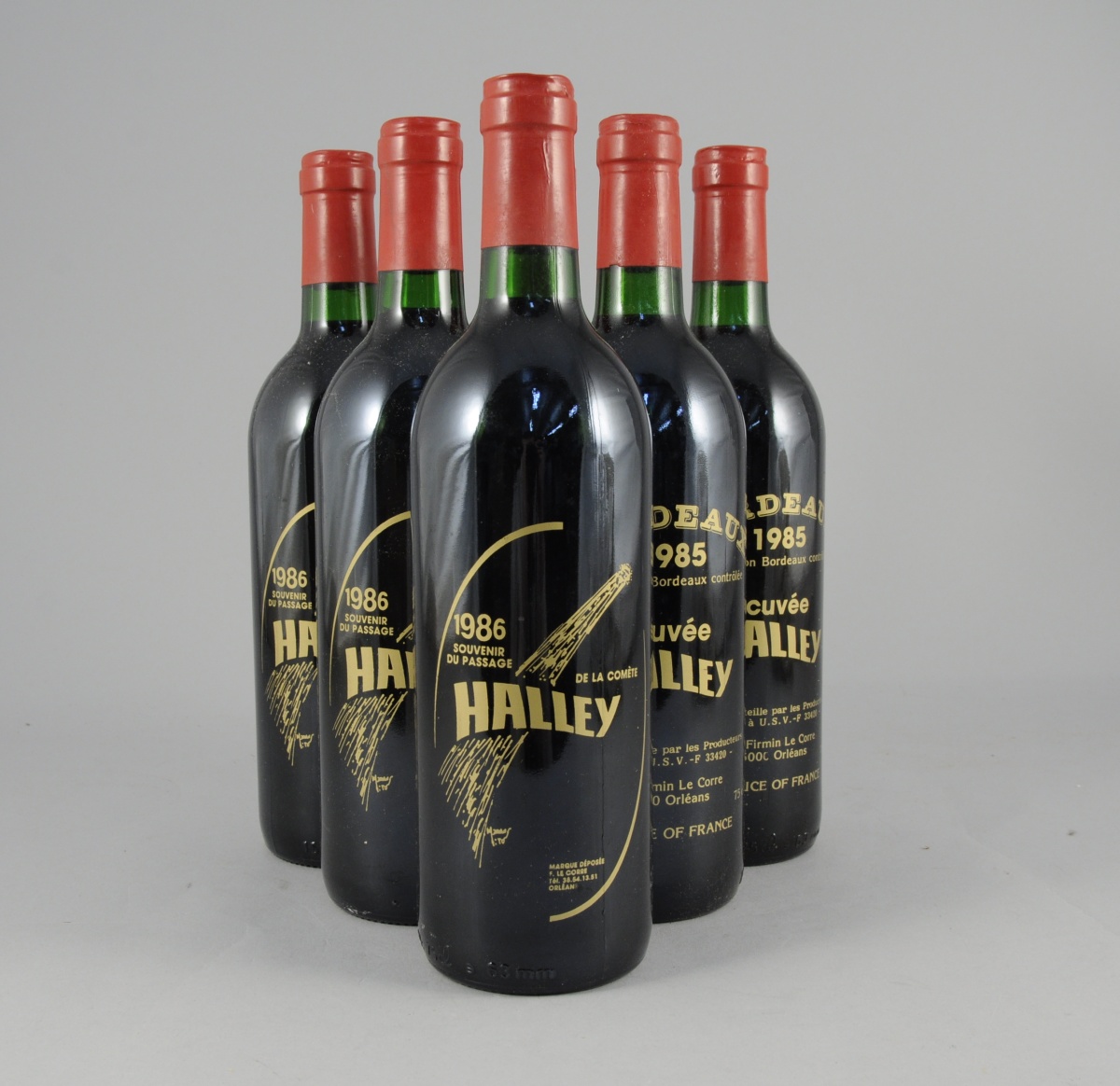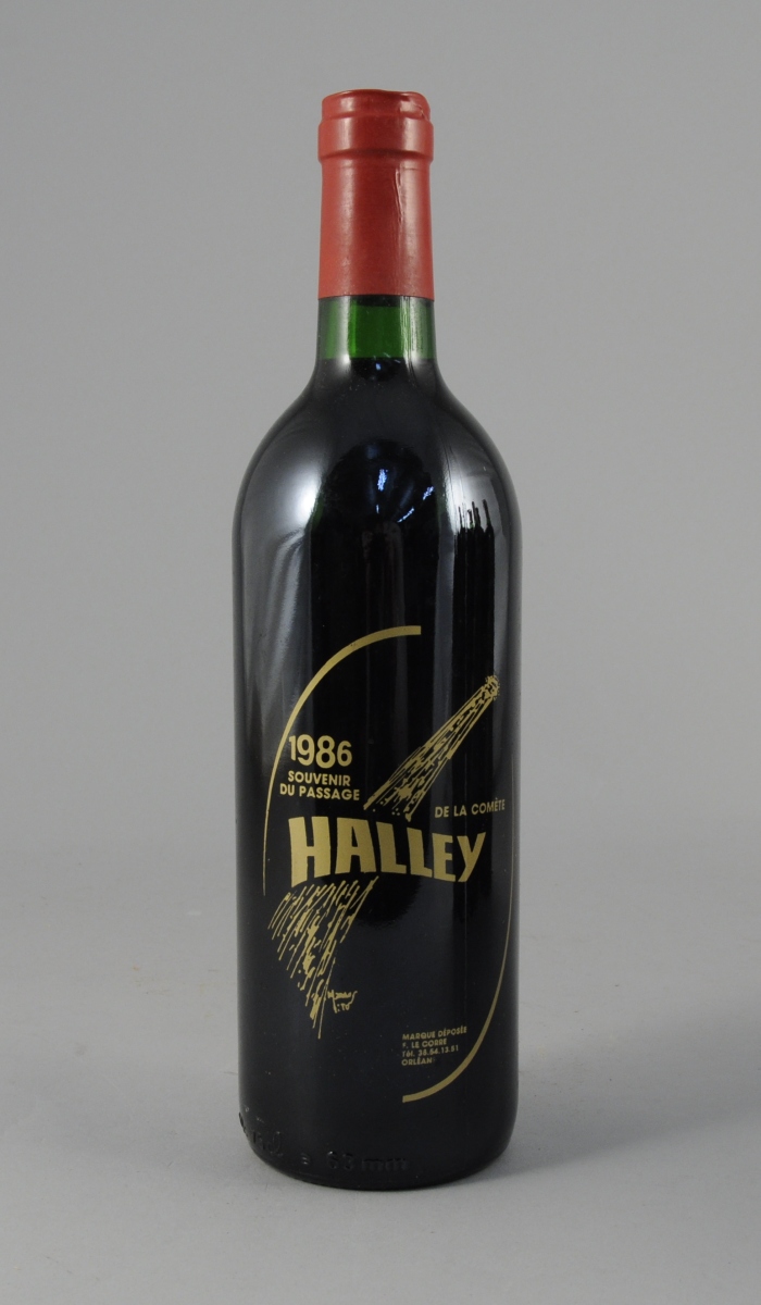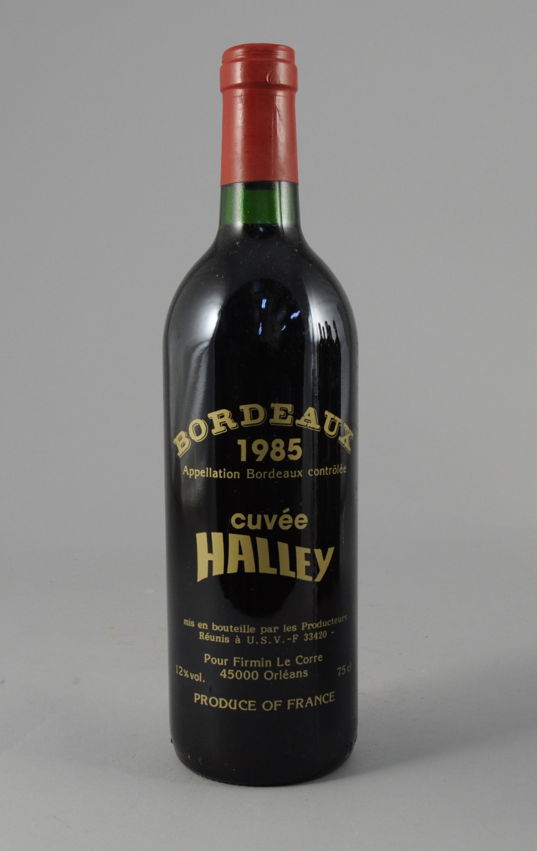 BORDEAUX, Cuvée Halley, 1985. 6 bouteilles commémorative du passage de la comète de Halley en 1986. Les Producteurs Réunis à U.S.V.F. F-33420 pour Firmin Le Corre à Orléans. Dernières bouteilles d'une cuvée de 2500 flacons. Dessin de Mito Malus.