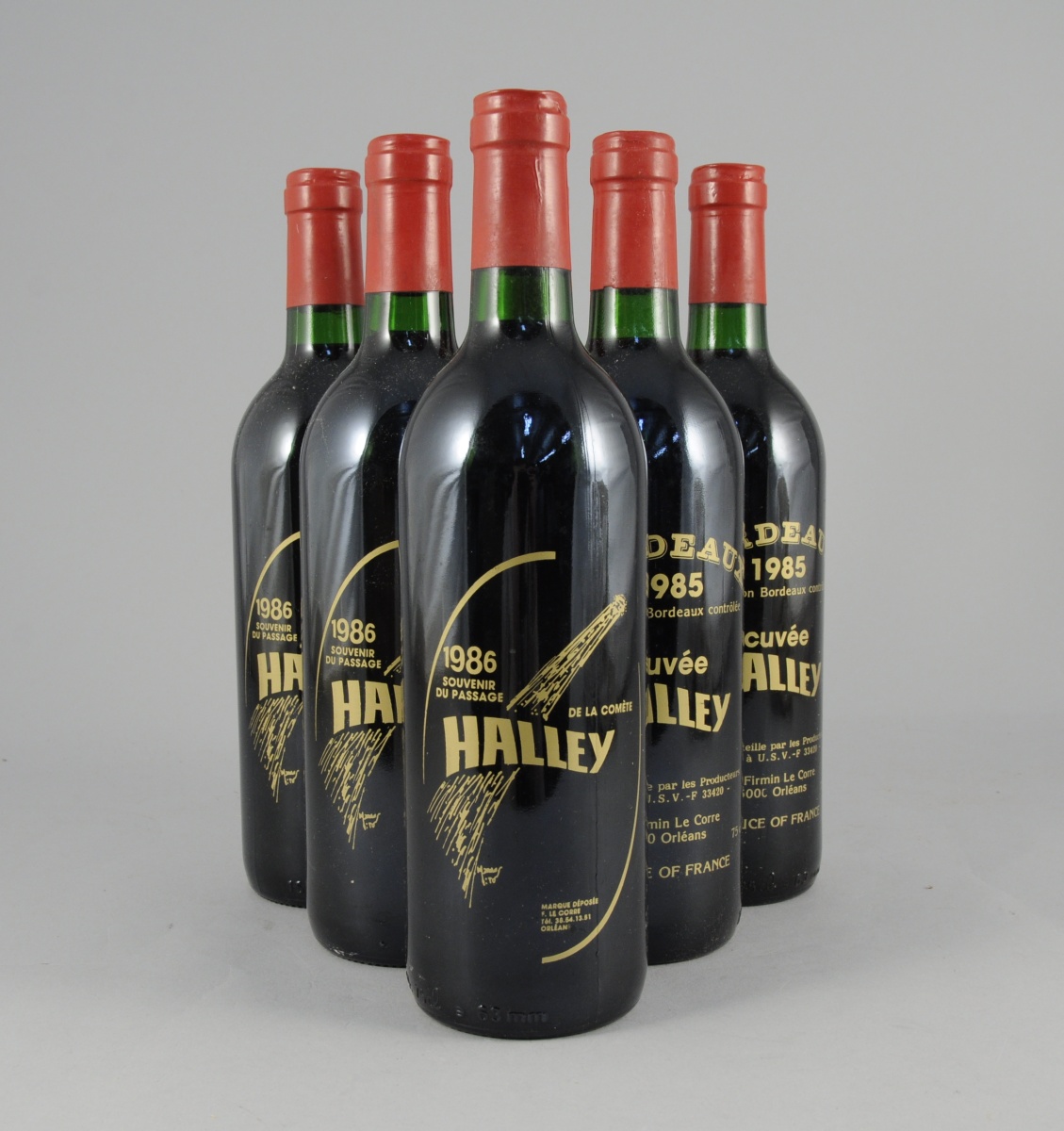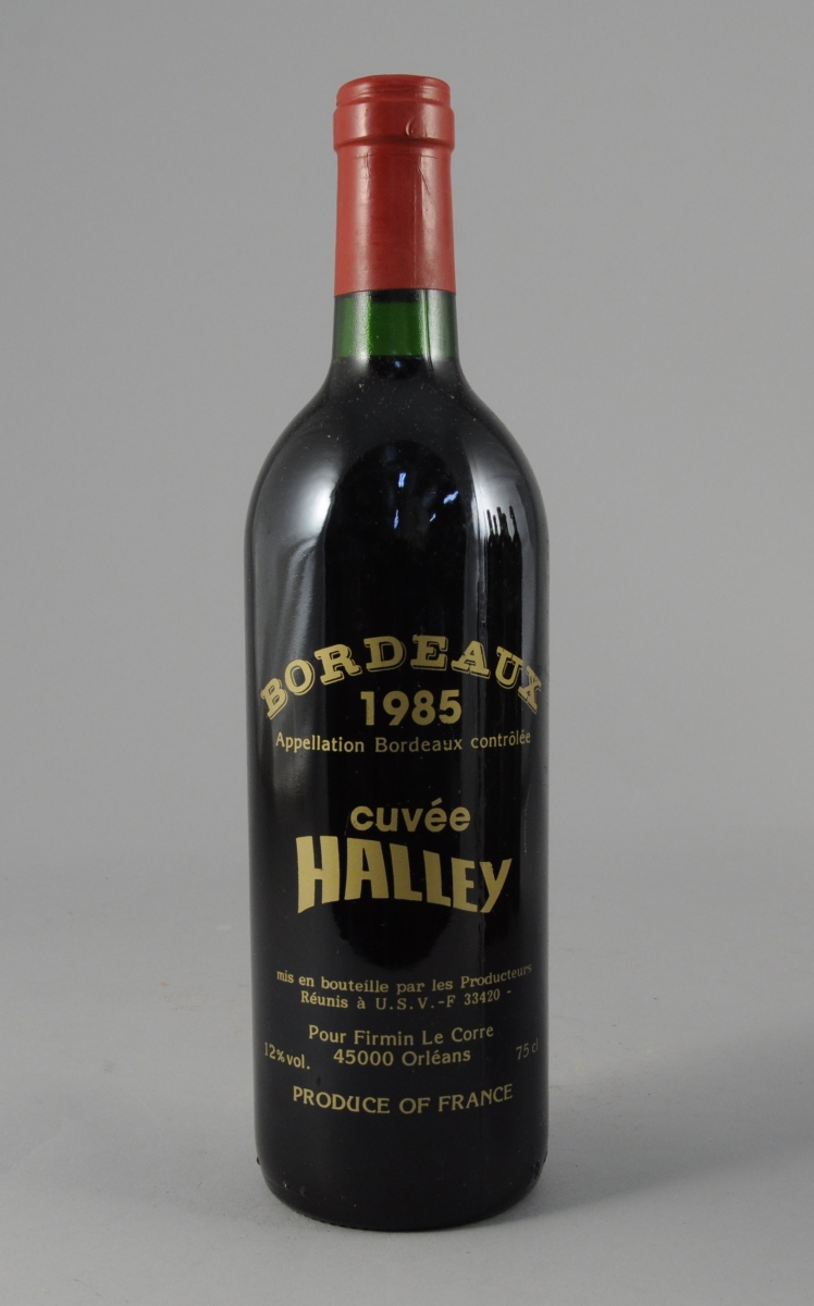 BORDEAUX, Cuvée Halley, 1985. 6 bouteilles commémorative du passage de la comète de Halley en 1986. Les Producteurs Réunis à U.S.V.F. F-33420 pour Firmin Le Corre à Orléans. Dernières bouteilles d'une cuvée de 2500 flacons. Dessin de Mito Malus.