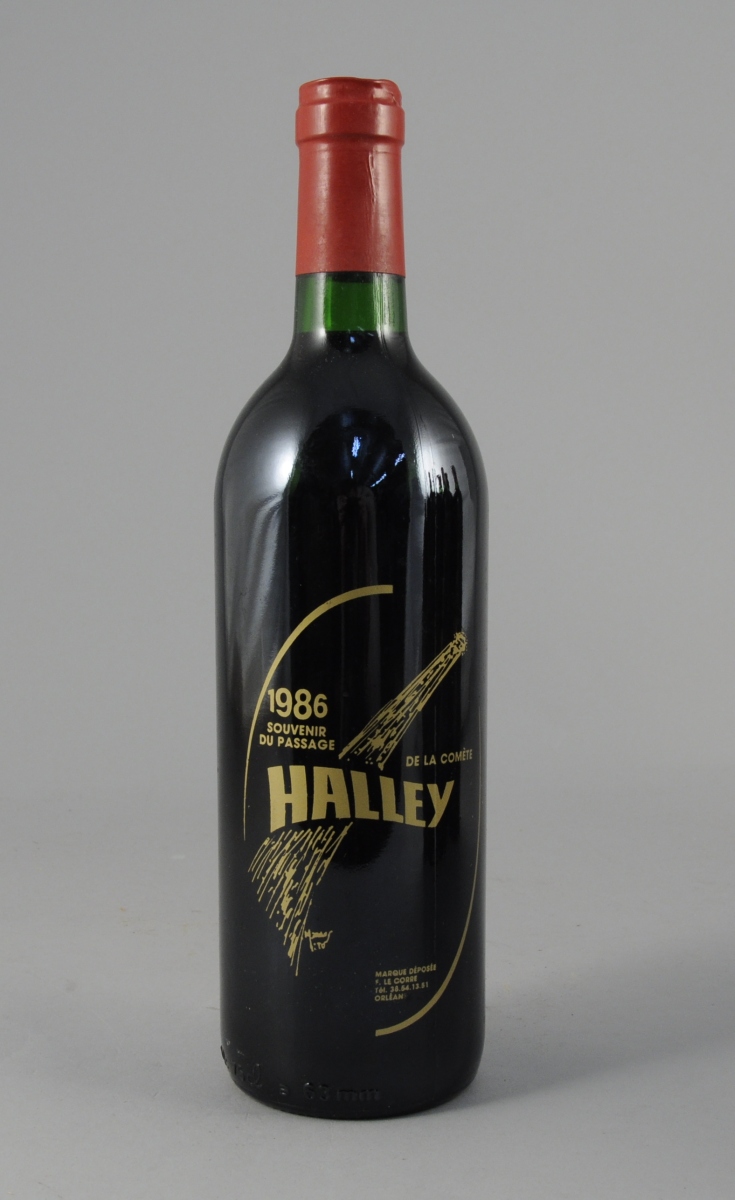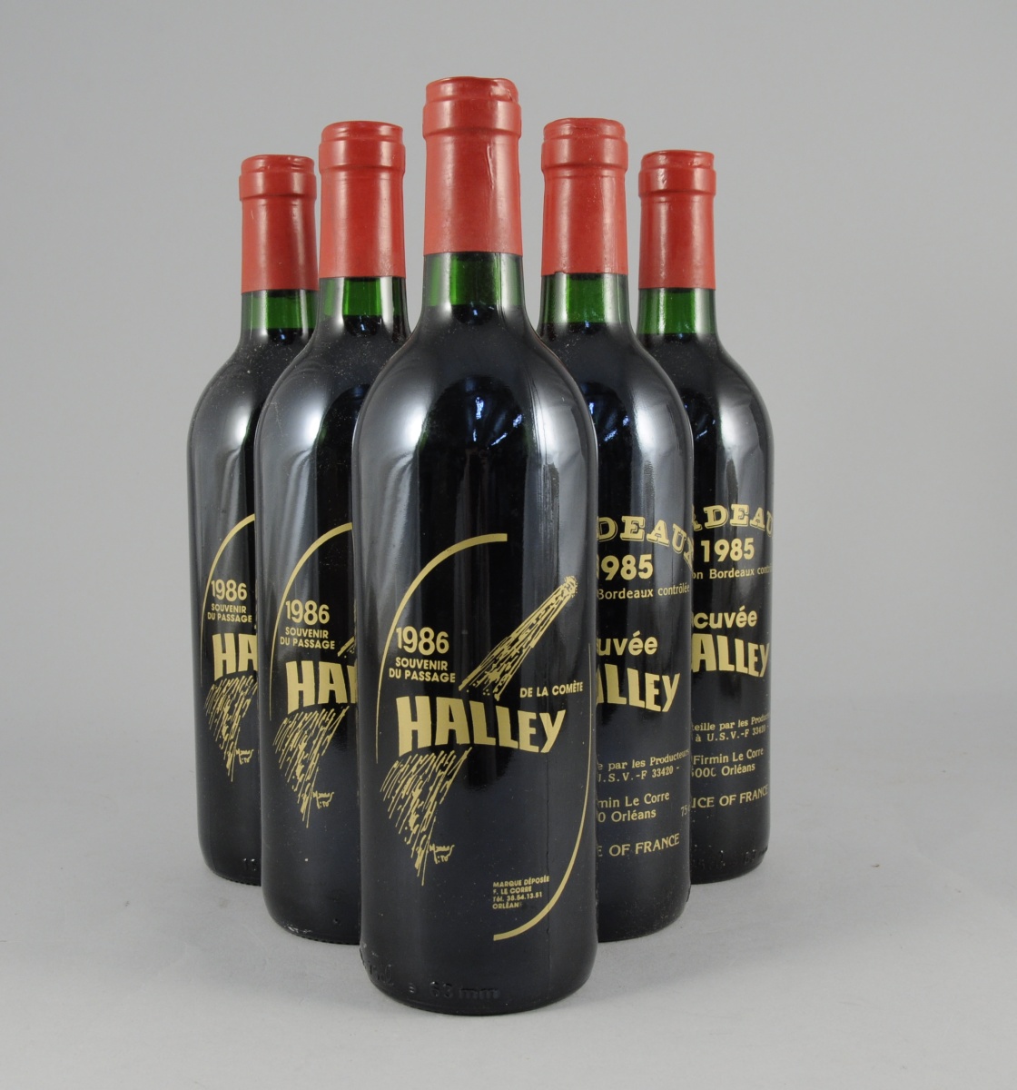 BORDEAUX, Cuvée Halley, 1985. 6 bouteilles commémorative du passage de la comète de Halley en 1986. Les Producteurs Réunis à U.S.V.F. F-33420 pour Firmin Le Corre à Orléans. Dernières bouteilles d'une cuvée de 2500 flacons. Dessin de Mito Malus.