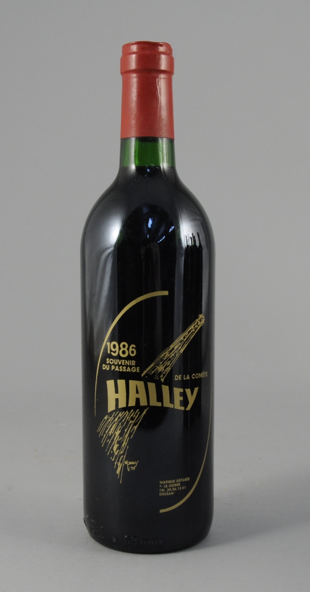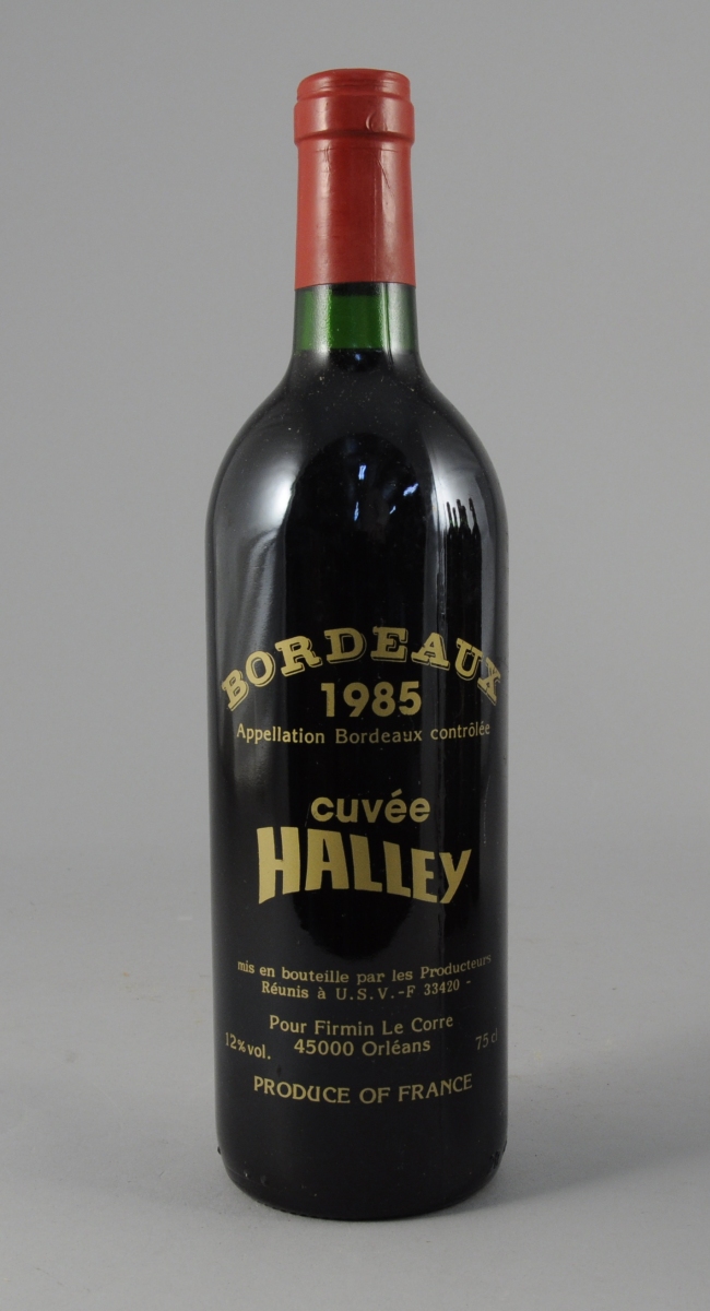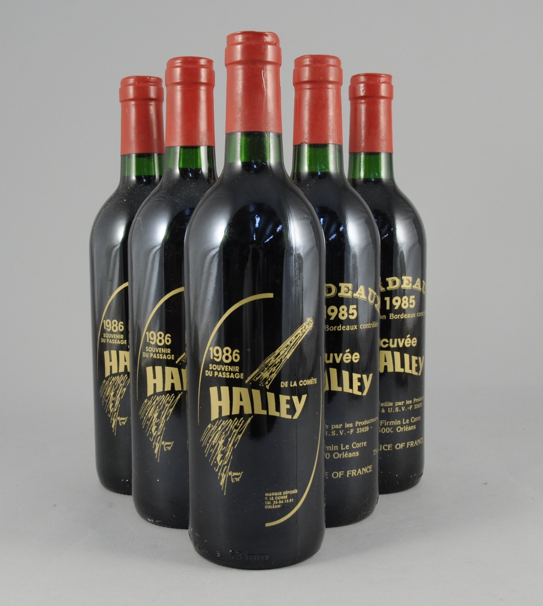 BORDEAUX, Cuvée Halley, 1985. 6 bouteilles commémorative du passage de la comète de Halley en 1986. Les Producteurs Réunis à U.S.V.F. F-33420 pour Firmin Le Corre à Orléans. Dernières bouteilles d'une cuvée de 2500 flacons. Dessin de Mito Malus.