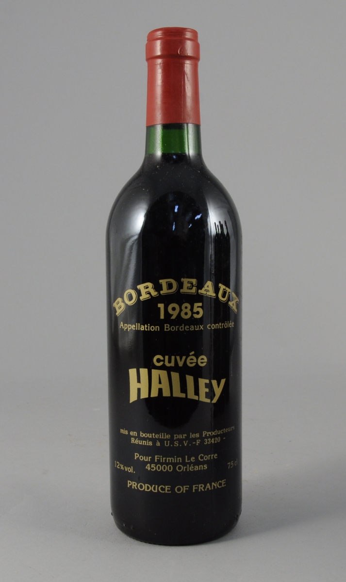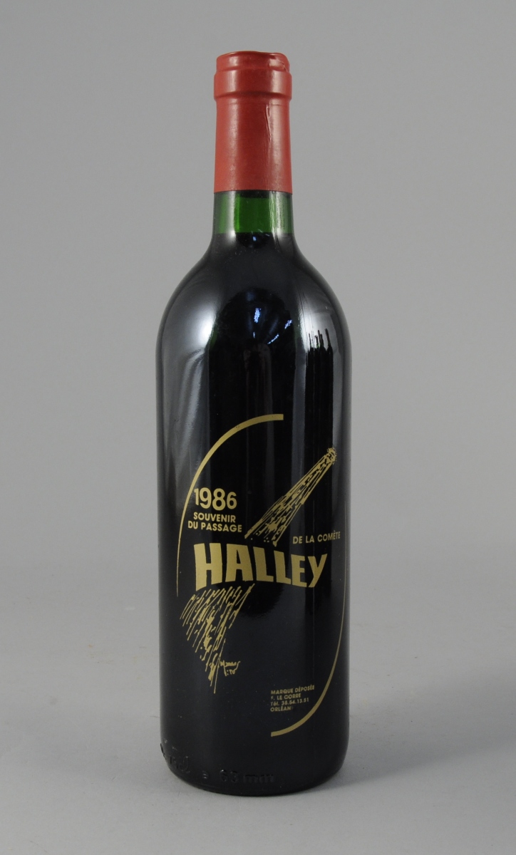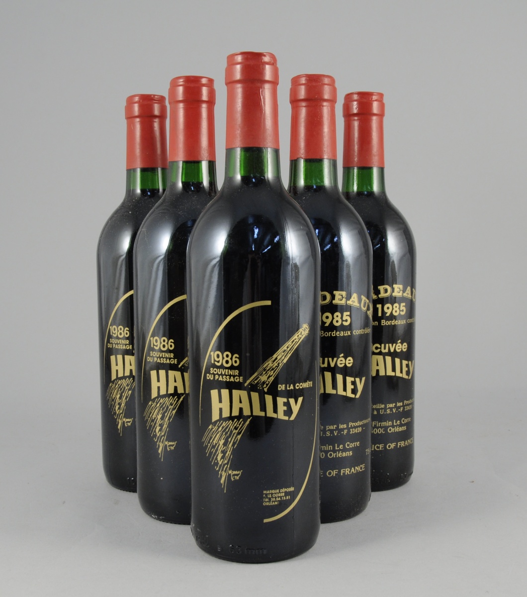 BORDEAUX, Cuvée Halley, 1985. 6 bouteilles commémorative du passage de la comète de Halley en 1986. Les Producteurs Réunis à U.S.V.F. F-33420 pour Firmin Le Corre à Orléans. Dernières bouteilles d'une cuvée de 2500 flacons. Dessin de Mito Malus.