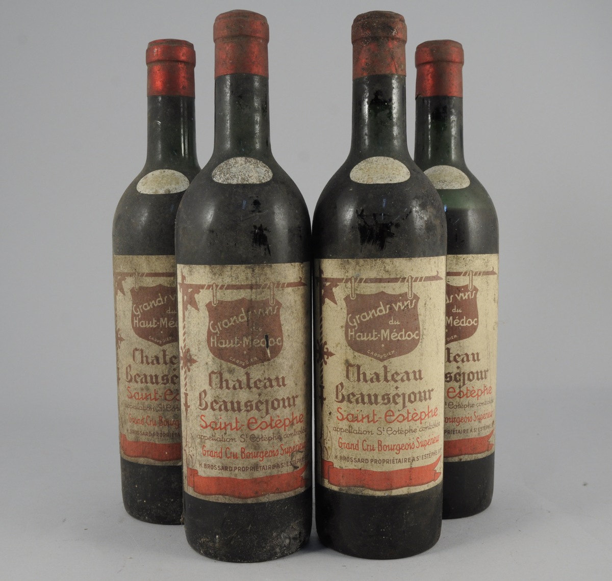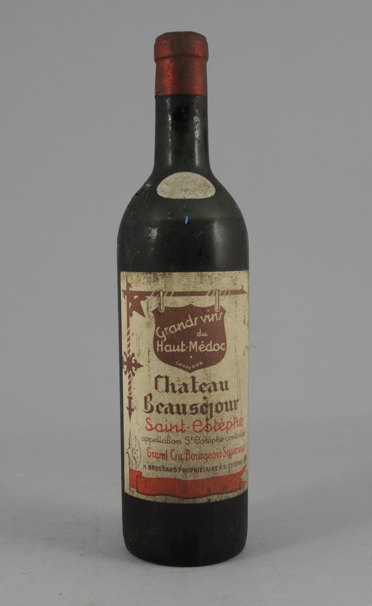 SAINT-ESTÈPHE, Château Beauséjour, 1955. 4 bouteilles, étiquettes sales et difficilement lisibles.