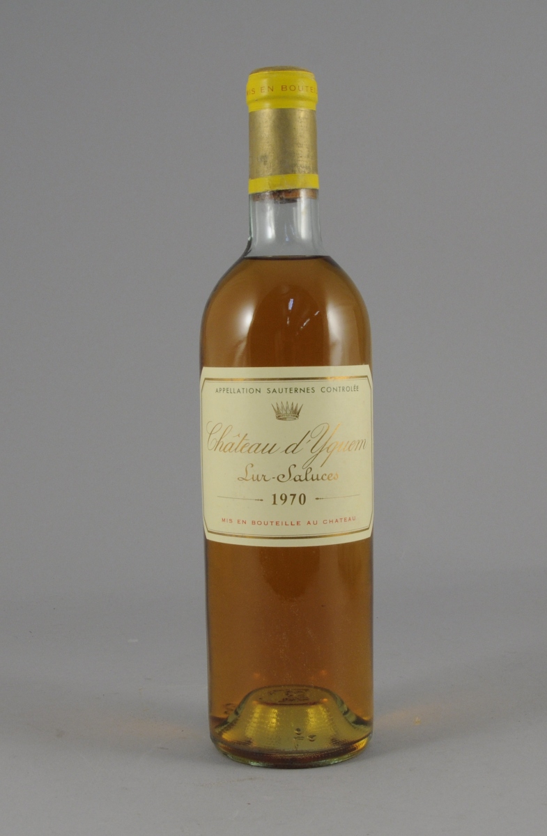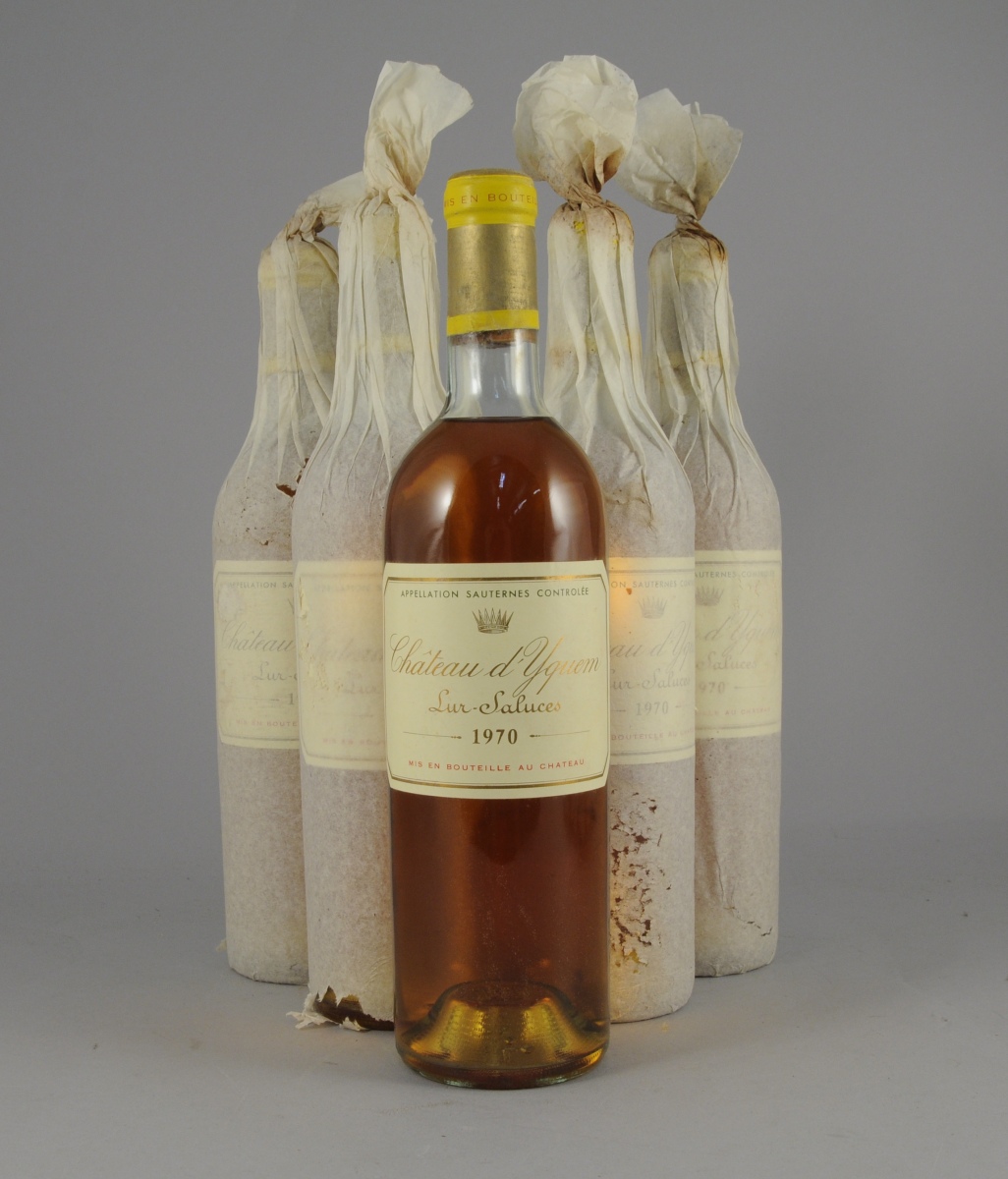 SAUTERNES, Château d'Yquem, Lur Saluces, 1970. 5 bouteilles enveloppées dans du papier de soie, caisse bois et paille.