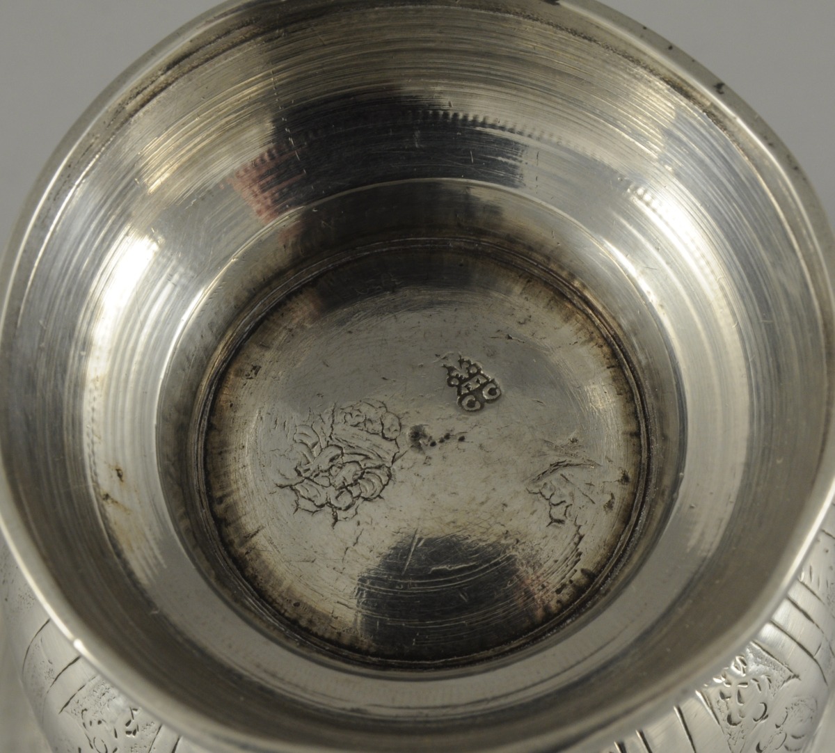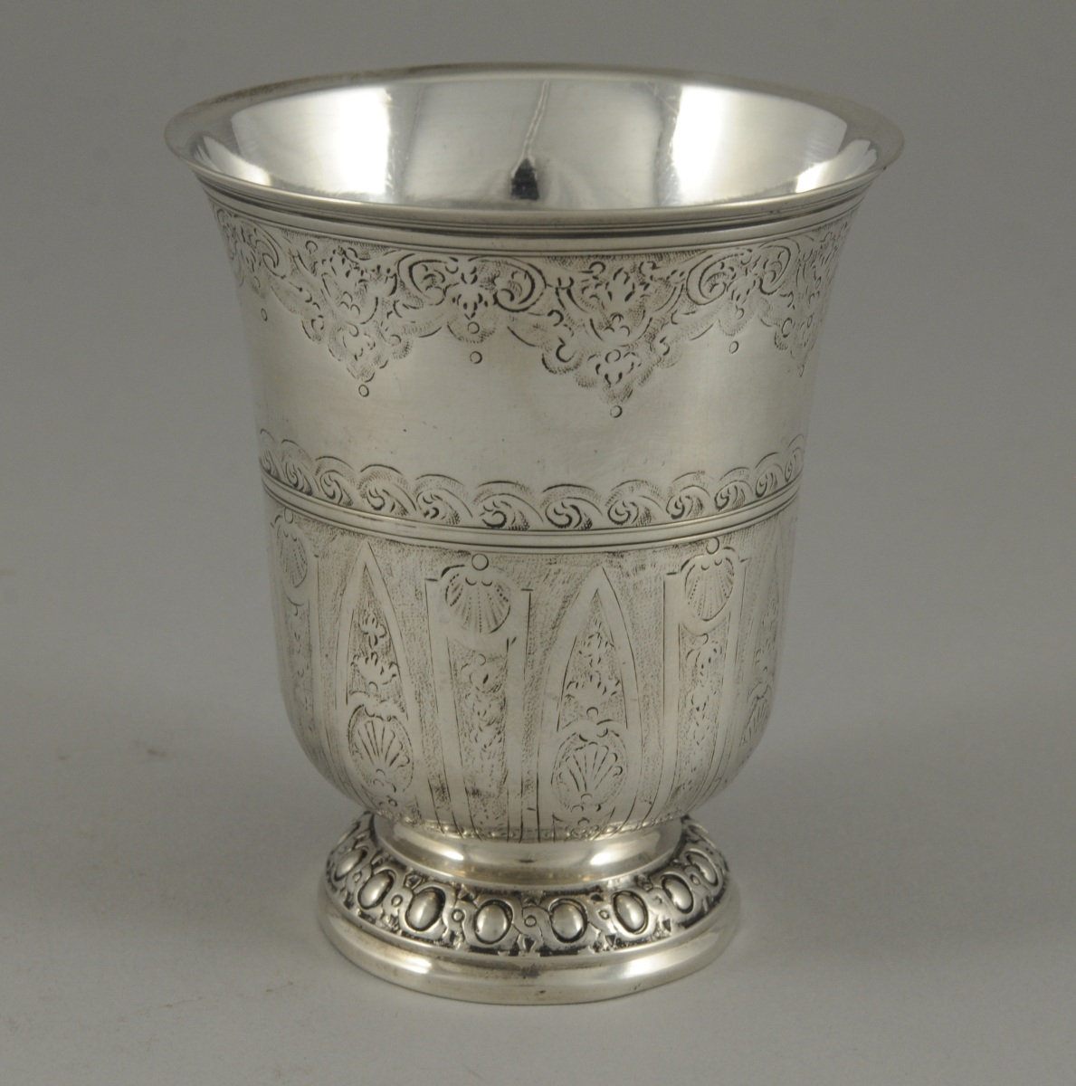 TIMBALE TULIPE en argent, sur piédouche à motifs d'une frise d'oves. Elle est gravée à mi-corps de feuilles lancéolées alternées, feuillages stylisés et coquilles et, sous le col, d'une frise de lambrequins. Une frise de postes sépare les deux registres. Inscription gravée à mi-hauteur "- GENEVIEVE - BAVDOT -". Poinçons aux Fermiers Généraux de la juridiction de Paris, 1737-1744.