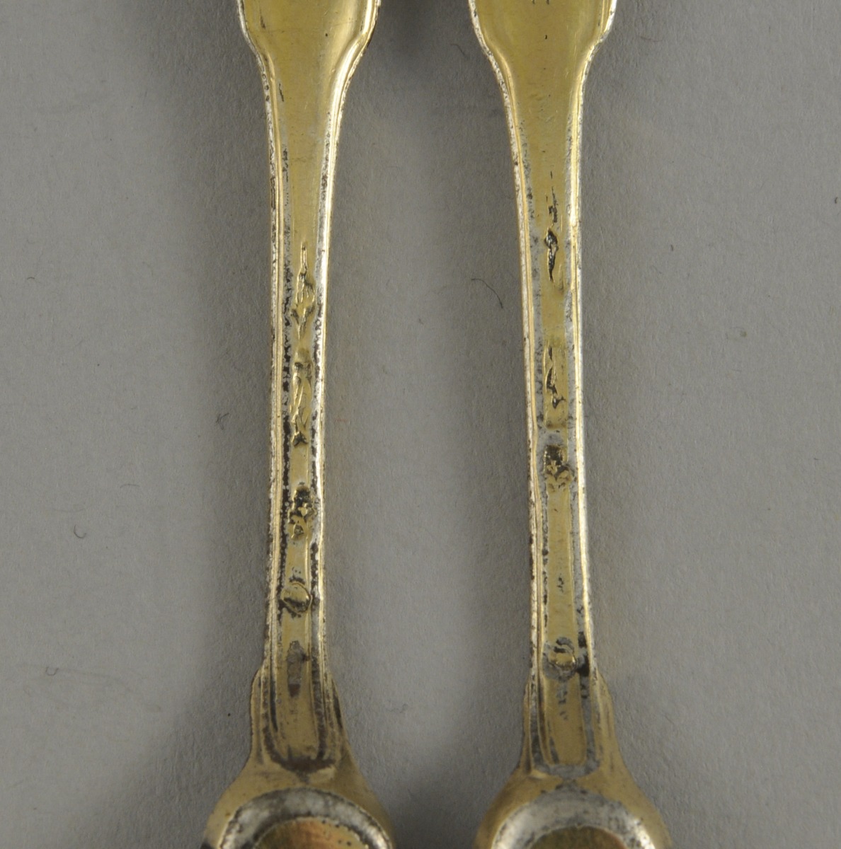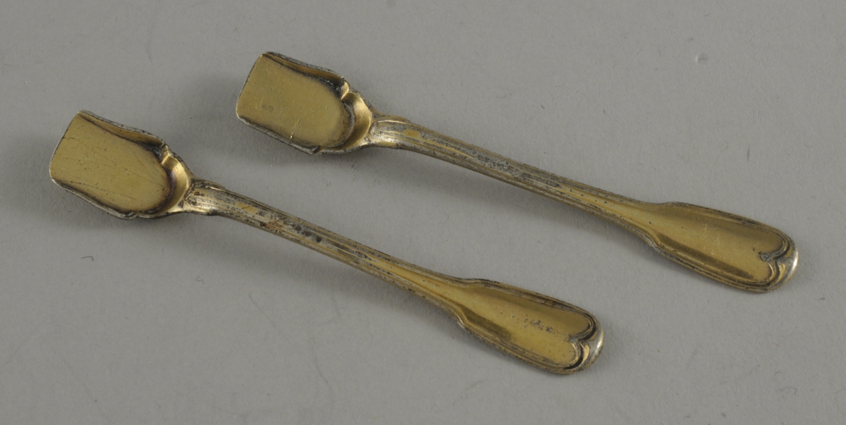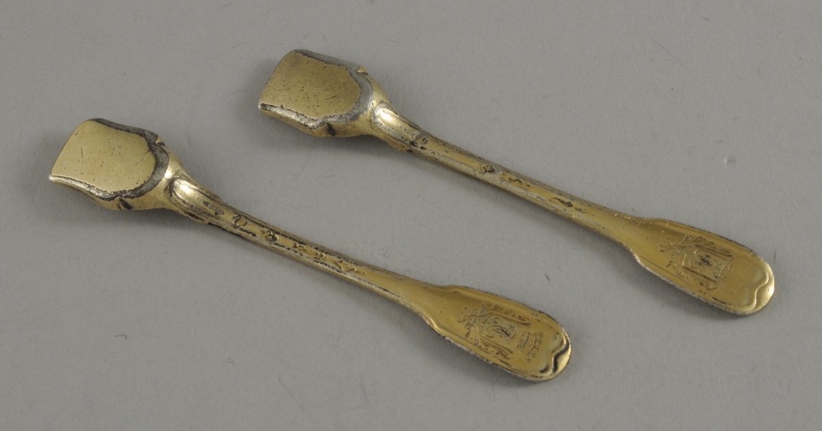 Paire de PELLES À SEL en vermeil, modèle à filets, gravées d'un écu monogrammé "JC" flanqué de branches de laurier et timbré d'une couronne de vicomte.